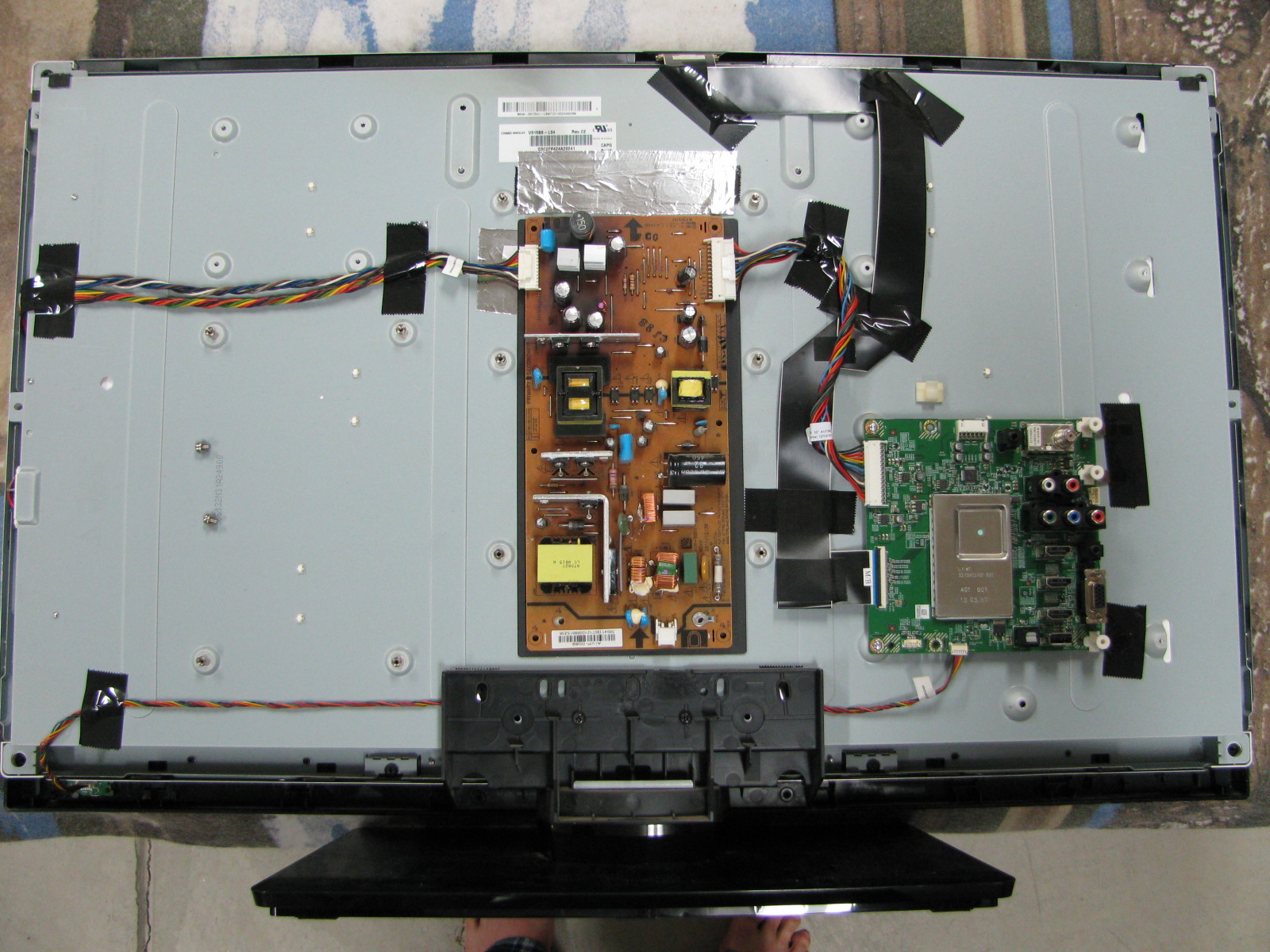 Just checking in to see if you replaced the capacitors? I have the same tv with the same problem. My power supply looks just like yours with dark spots besides the capacitors on the upper left. Those caps are bulging as well. Hope to hear from you!