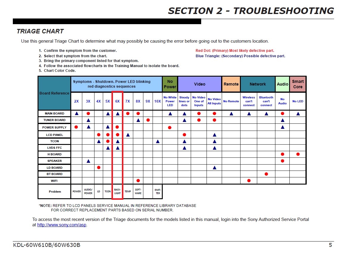 Thanks Tom, as per service manual, it says 6 red blinking means either its (Primary) Most likely defective part. (POWER SUPPLY or LCD PANEL) and (Secondary) Possible defective part (MAIN BOARD or TCON or LVDS FFC) attached file is service manual with screen image of above predictions,