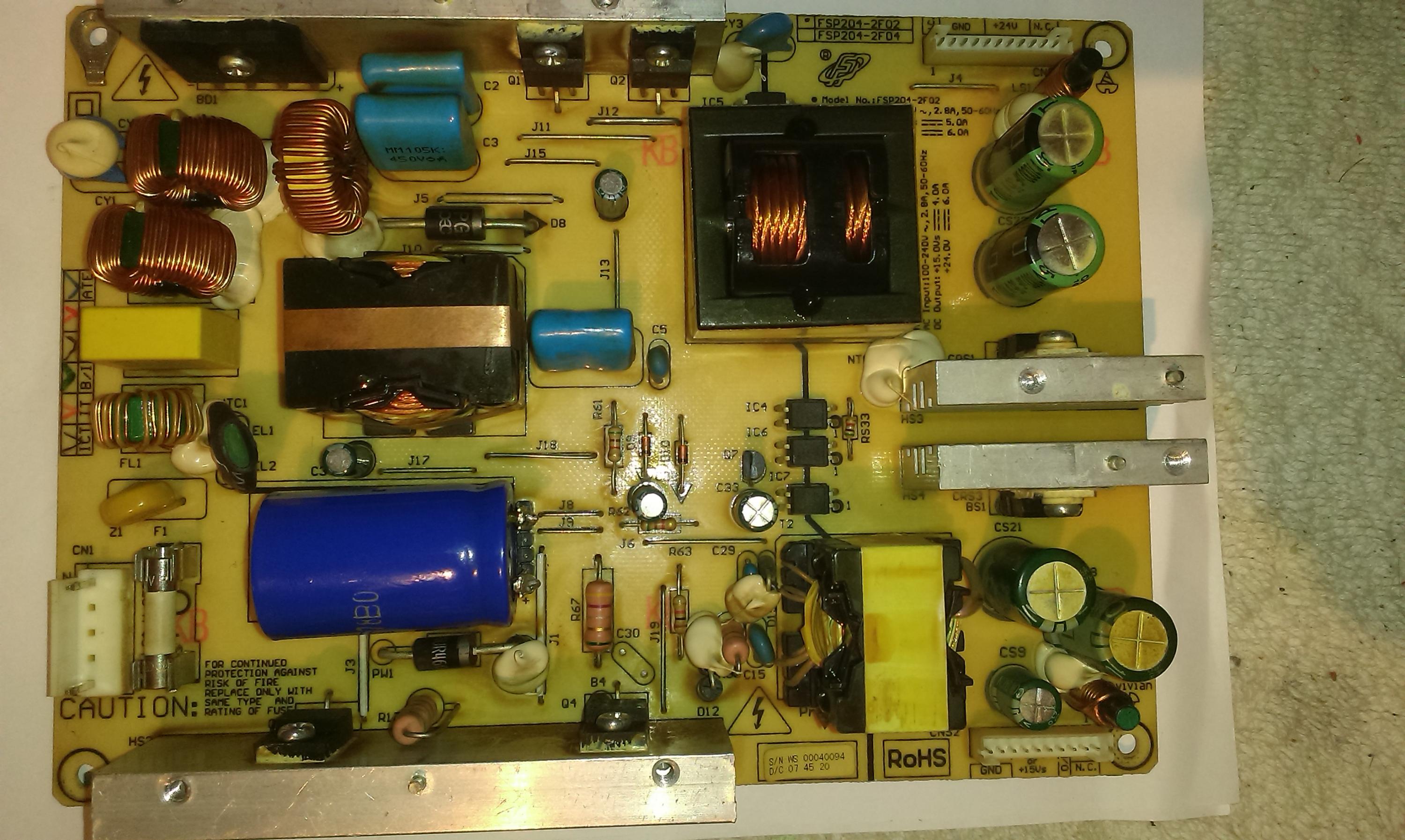 hi......this my first thread.....so here goes..Only little knowledge in this field, just basic..thanks. MODEL. FSP 204-2F02...can't find much info for this...Its from a bush lcd32tv07hd....i've only been given the supply,to test......from a friend.he says it blew the inverter,I would like to know the value of two resistors ,because they are showing one 00.7 ohms and the other same.Theres two power out puts..12v.. giving 12.11v and 24v..no output......the one marked O/F on the 12v side,gettting upto 7v.............assuming this is standby...I am thinking it as two supplys......12v for main board and 24v for the inverter. i can get a replacement board if need be.......[may be wrong]..you guys will know......cheers, and sorry for long post............sorry forgot to mention, he said the tv screen would flash on and off......