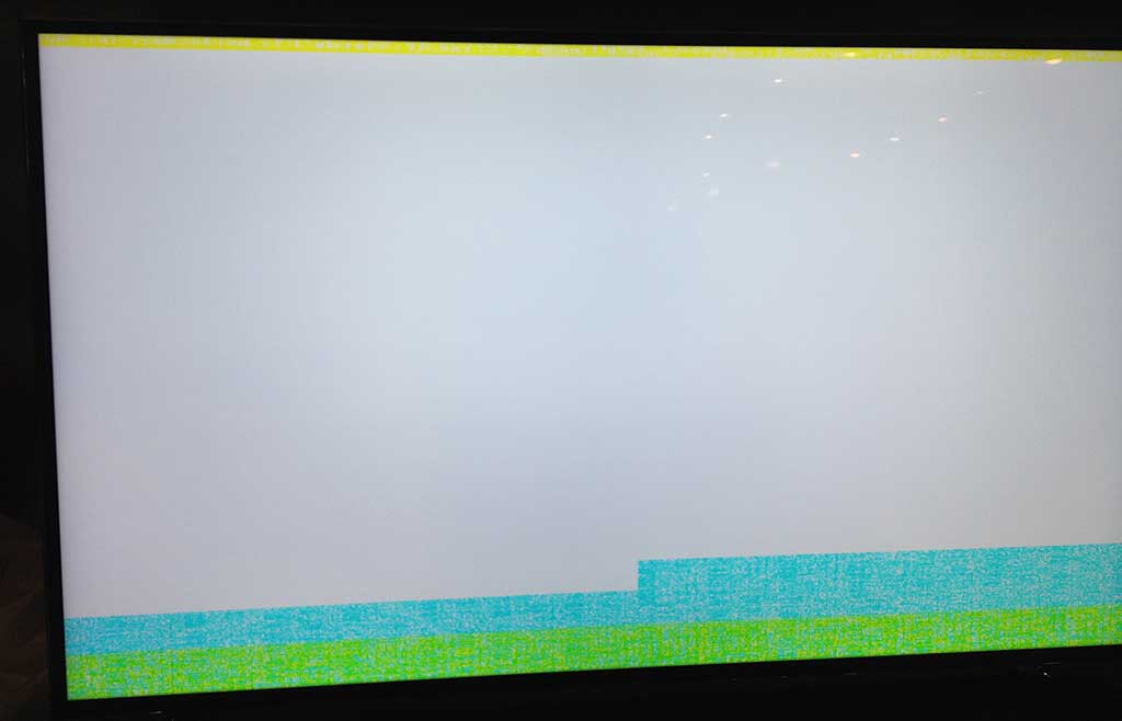 When the TV is turned on with the one connect box, nothing is displayed on screen, not even the smart TV logo nor the smart apps logo shows up. However if you unplug your one connect box from the TV, and let is sit for about 30-45 seconds, your screen will turn on, and show a bright white image with a bit of green and blue near the bottom of the screen.