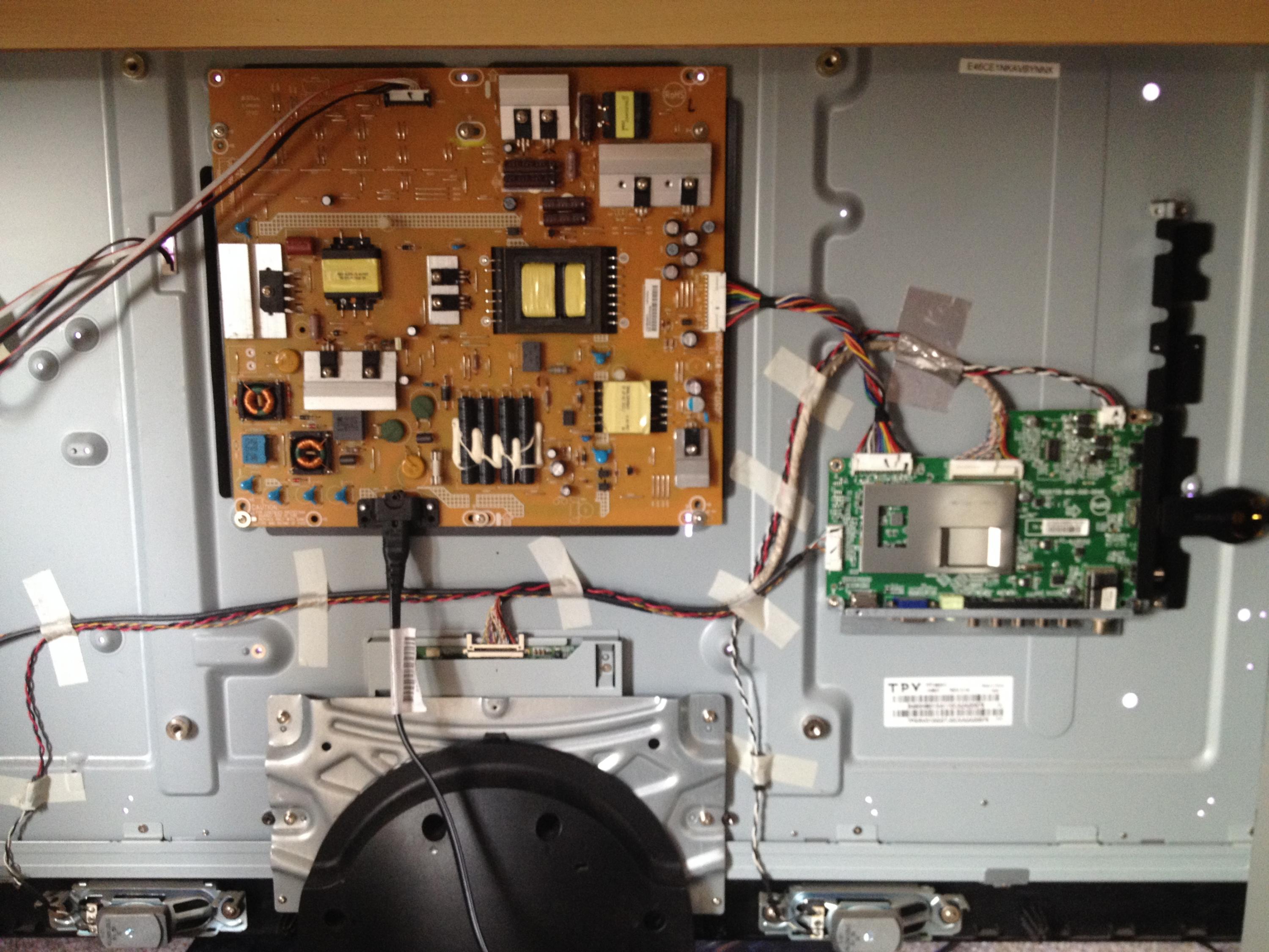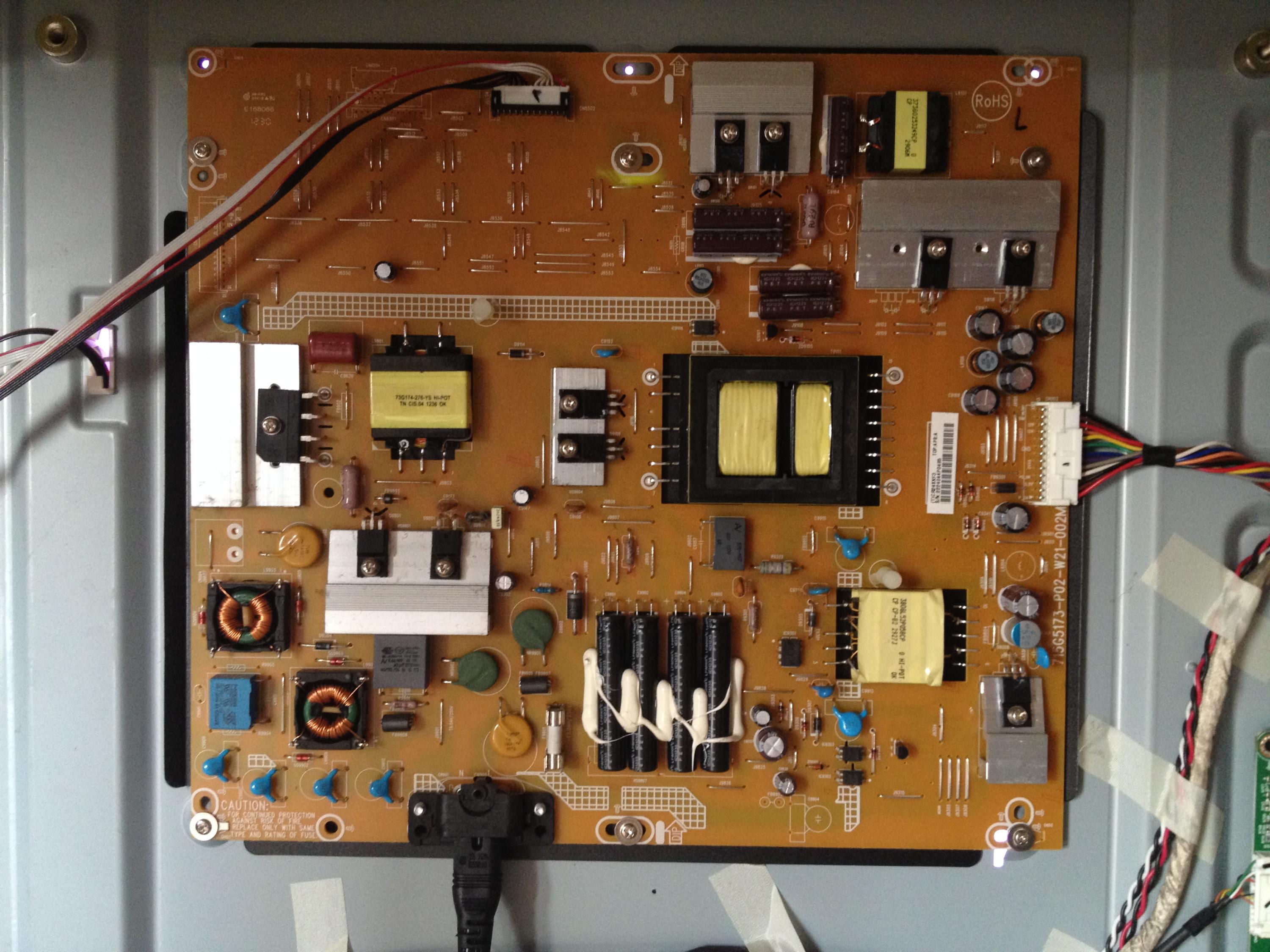 This morning, I got the TV to boot after 3-4 power cycles. I took the back panel off and observed the following: