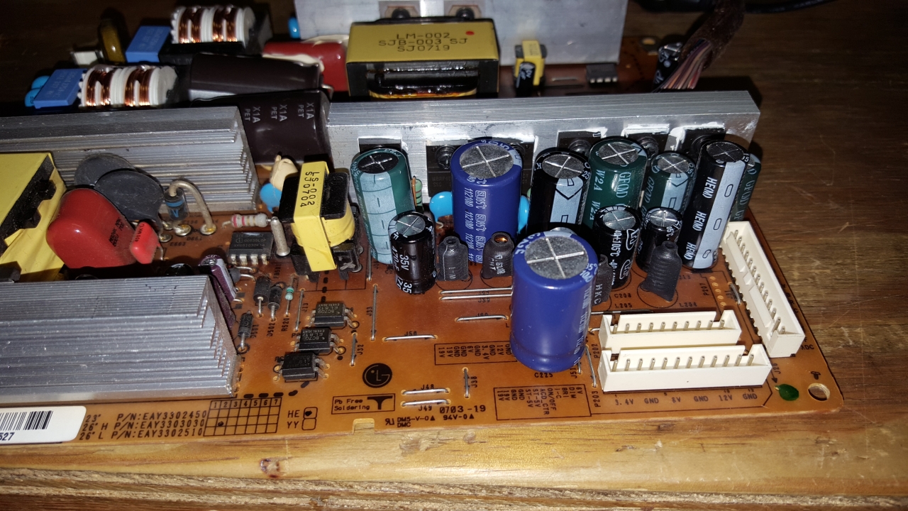 No fuses were blown. When i went to repair the jack I saw this board...(see pics) There were 2 badly swolen very cheap 10v off brand caps (also pic). One was total failed the other was almost gone. i noticed that there should have been a 25v or 35v in that position.