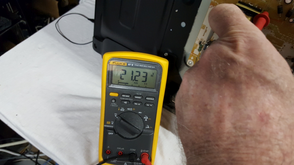I started removing the caps in the path until I found the short. 9 in total. Only 1 was shorted and it WAS on the 21v rail next to the audio chip. Likely reason they failed was it appears the factory reduced the number of filter caps to save money. (you can see where the schematic was engineered for more) Anyway it is now fixed and all I used was 9 new SMD caps 4 -.1uf and 5 - 4.7uf. (I didn't put any i removed back on).
