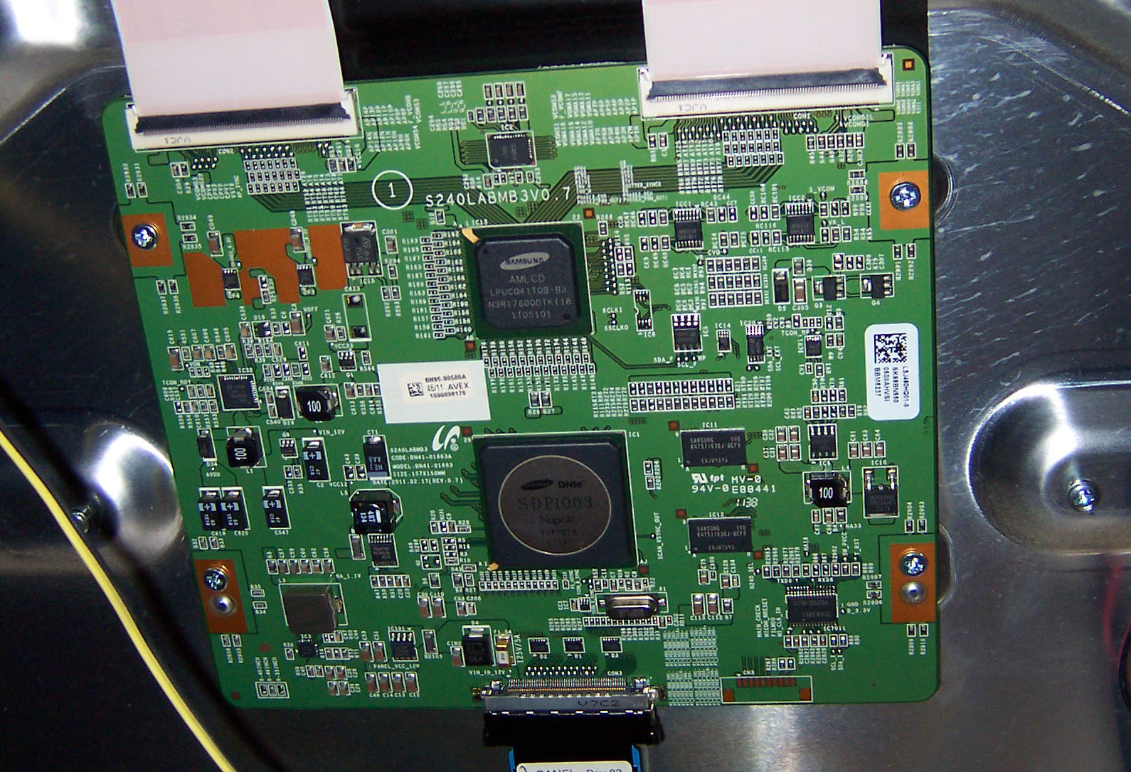 I have a Samsung UE46D7000 (Panel: LTJ460HQ01-B, t-con: S240LABMB3V0.7) with the display problem exhibited in the attached photographs (both sides of t-con connected, and each side connected seperately - failure in left upper quadrant)
