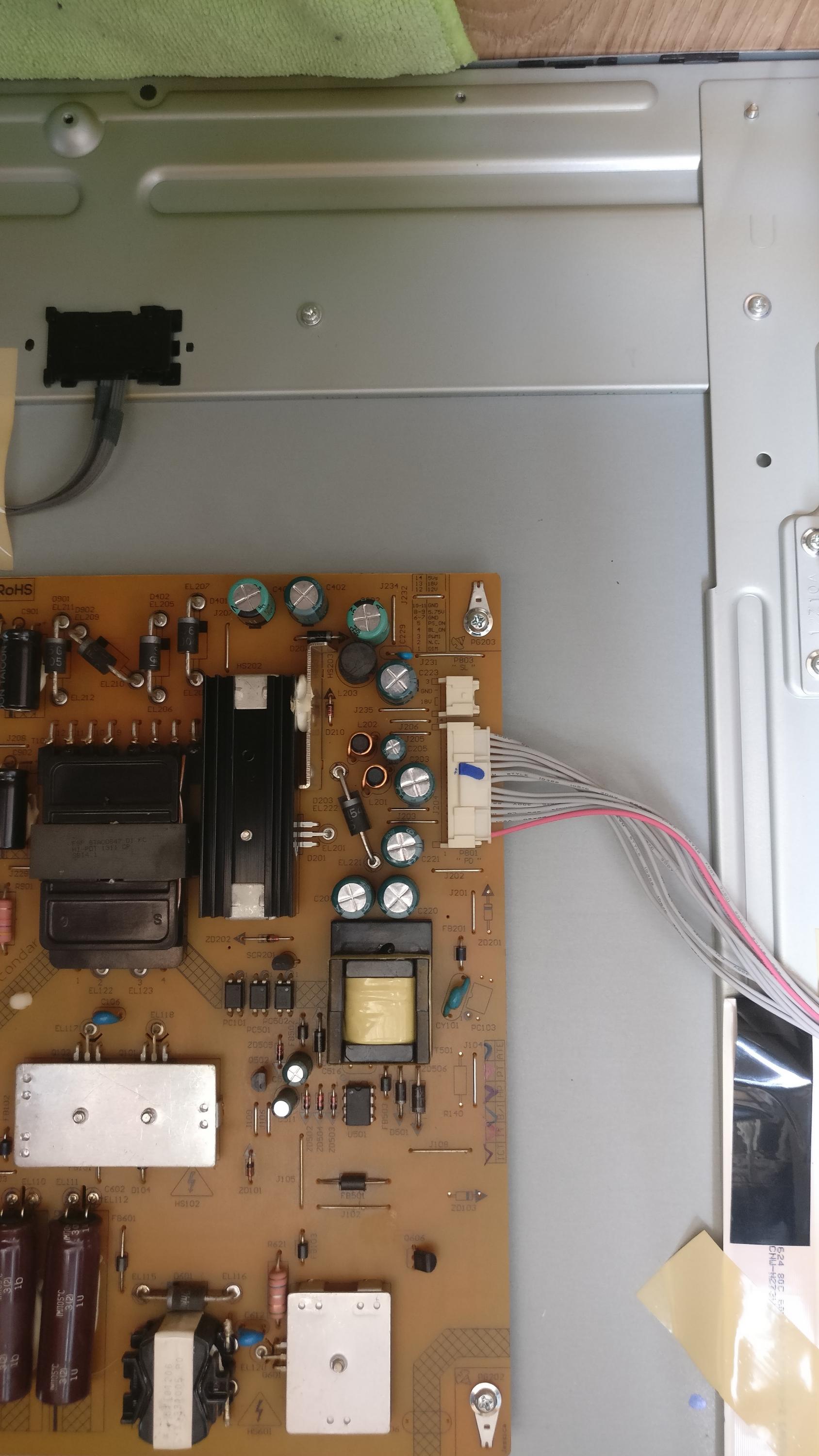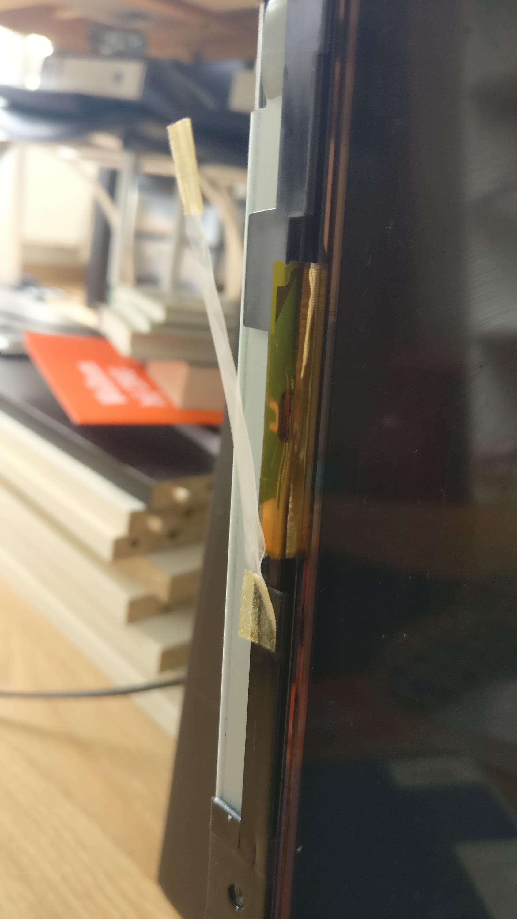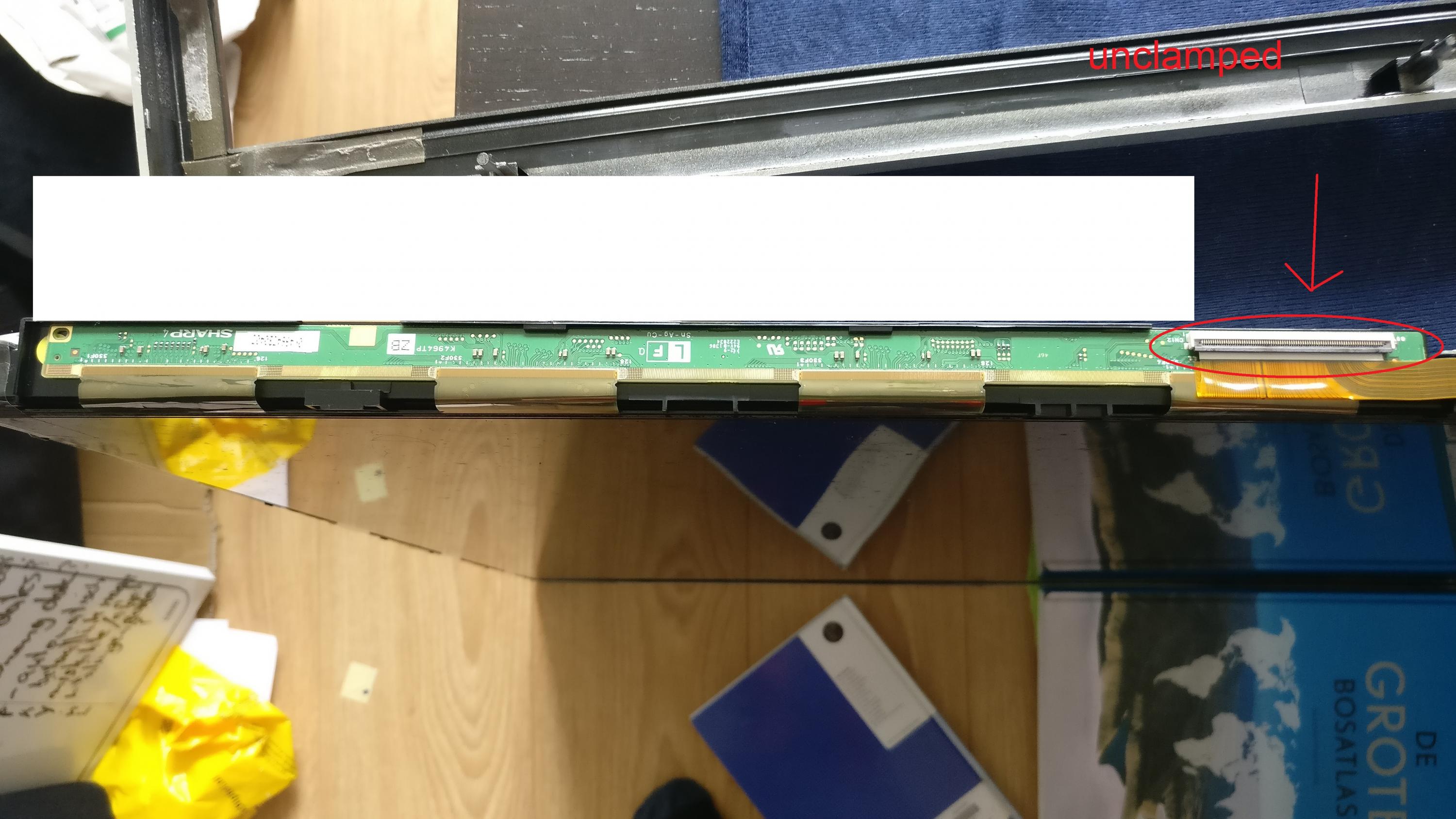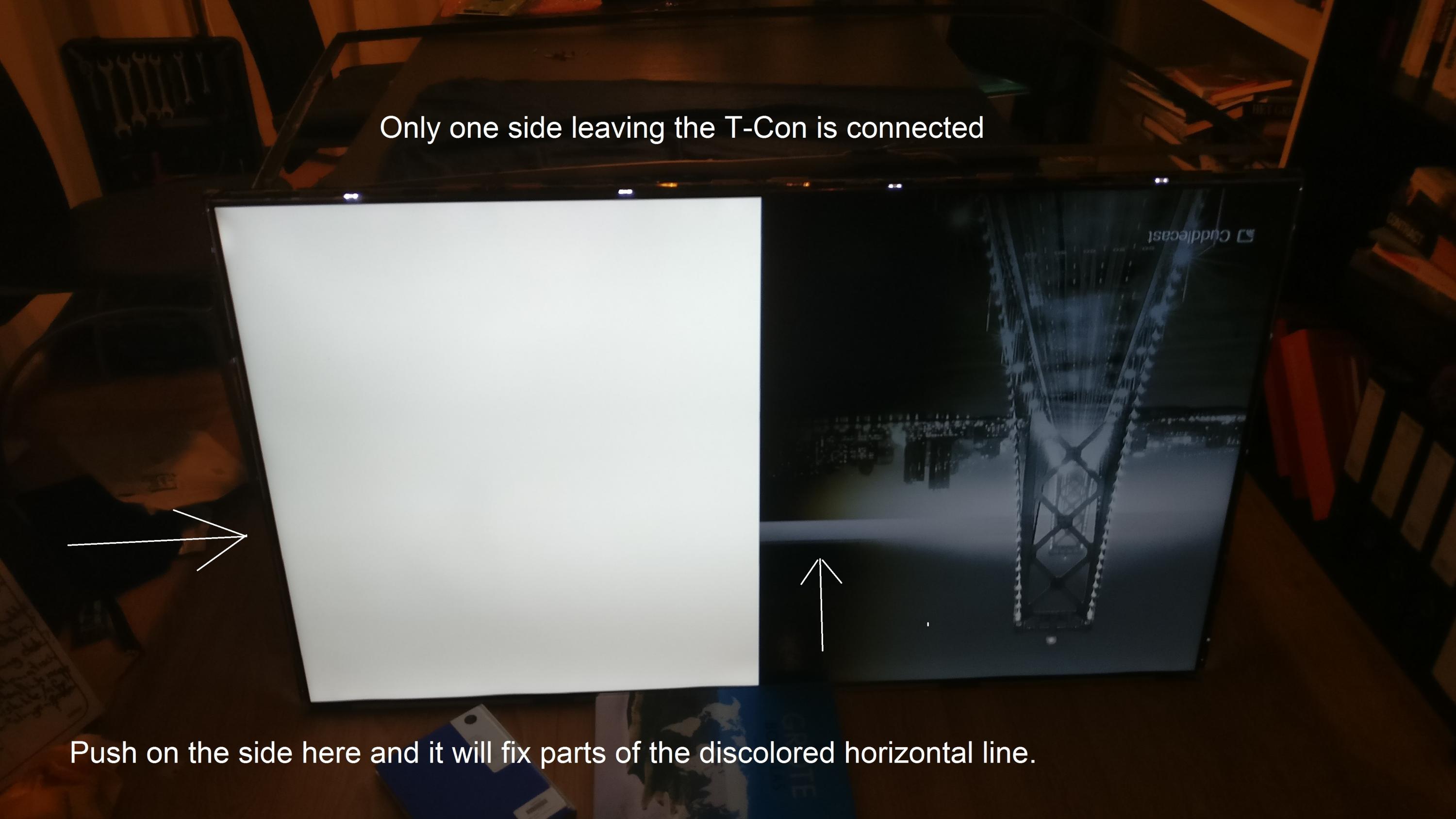 I read up on the Sharp TV sets and people are pulling out the side driver boards. I opened it up myself and on the sides small ribbons with a chip on it are hanging out on their own not connected to anything except the LCD itself. One of these looks a little bit burned, on the bad side. When I push it while the set is on it will temporarily fix parts of the horizontal line on the good side. See the picture I attached.