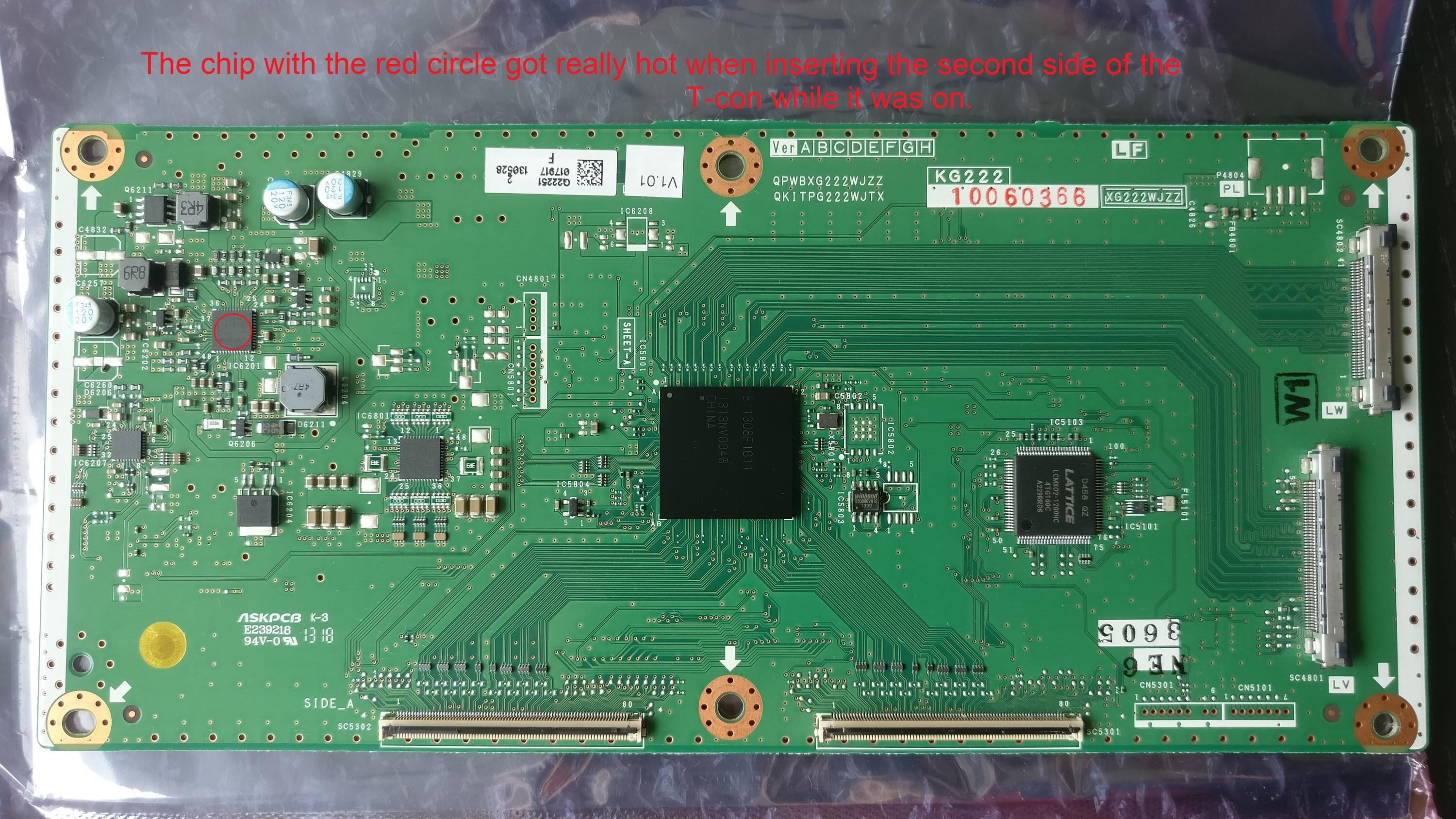 At this point I feared for the LCD but I ordered a new T-con. It arrived, it didn't help, the backlight didn't turn on either with the new T-con. I decided to insert the t-con ribbon cable going to the LCD while the set was on. The screen flickered the T-con made a buzzing sound and 1 chip in particular got really hot (see picture). Unfortunately I wasn't able to check the bad side of the panel while I tried this since I had the TV flat on the table with only the good side sticking out.