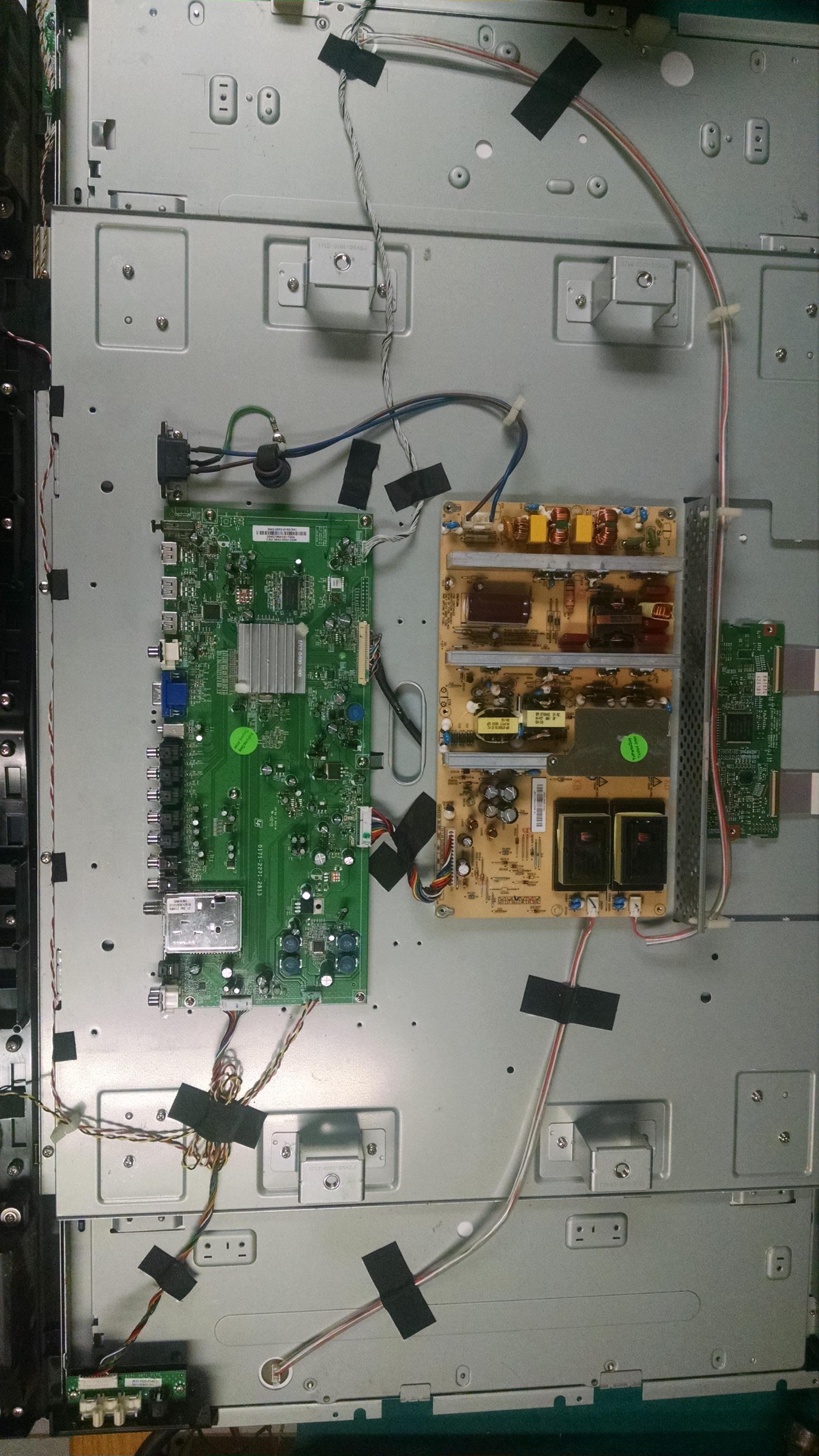 This is the TV This TV is a little different from the Samsung I have worked on. Power supply is on the Left side, Main Bd is on the right side, T-CON , not in the picture is on the bottom. I am assuming that the boards in the middle are the LED... - Loading...