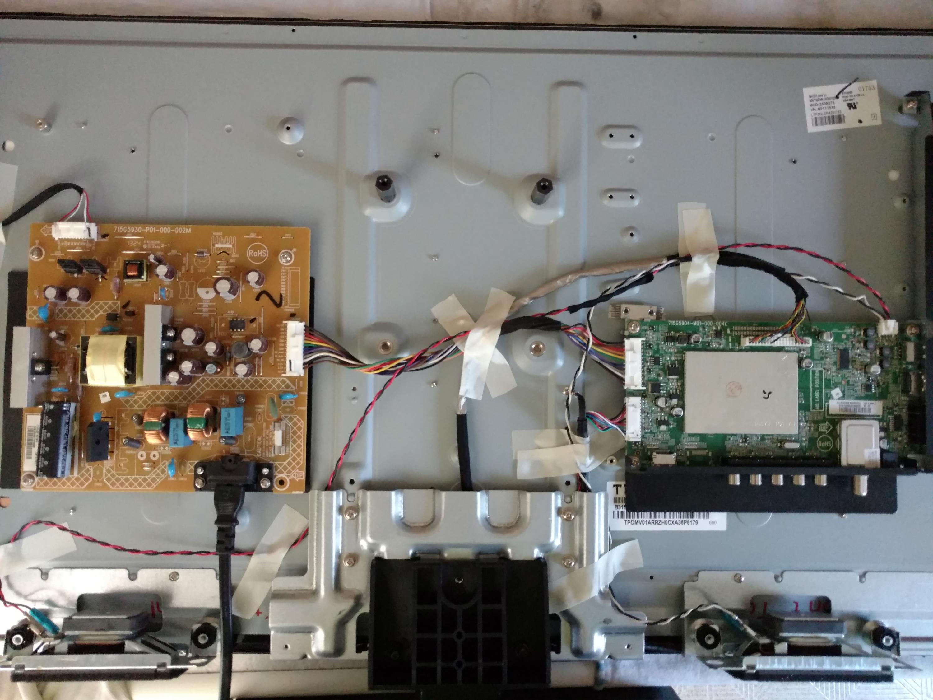 I'm working on this little Vizio LCD and it's got me stumped. What's happening is that when it is first plugged in, I can press the button to power it up, which it does, but it then promptly freezes without lighting the backlights or displaying anything on screen after that point. From here, no amount of tapping or holding of the power button will shut it down or elicit any further response.