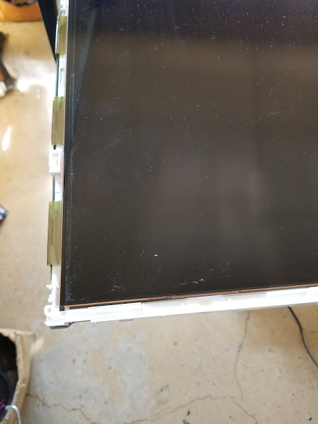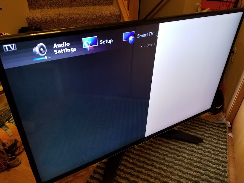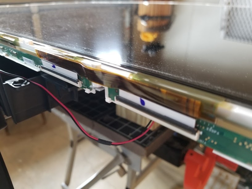 So far I've tried replacing the main board and a t-con board purchased off of ebay with no change in the tv. I also removed the ribbon cables from the t-con board and the backlight came on. When I removed the left two ribbon cables from the t-con board, the screen showed a white screen on the side with the removed ribbons and a picture on the other half of the screen. When I removed only the far left ribbon cable from the t-con board, the screen showed thin colored vertical lines on the side with the removed ribbon cable and a picture on the other half. I've tried to look at the side tabs, but there is nothing connected to the side tabs on the tv that I've been able to find, only the tabs on the bottom of the lcd panel.