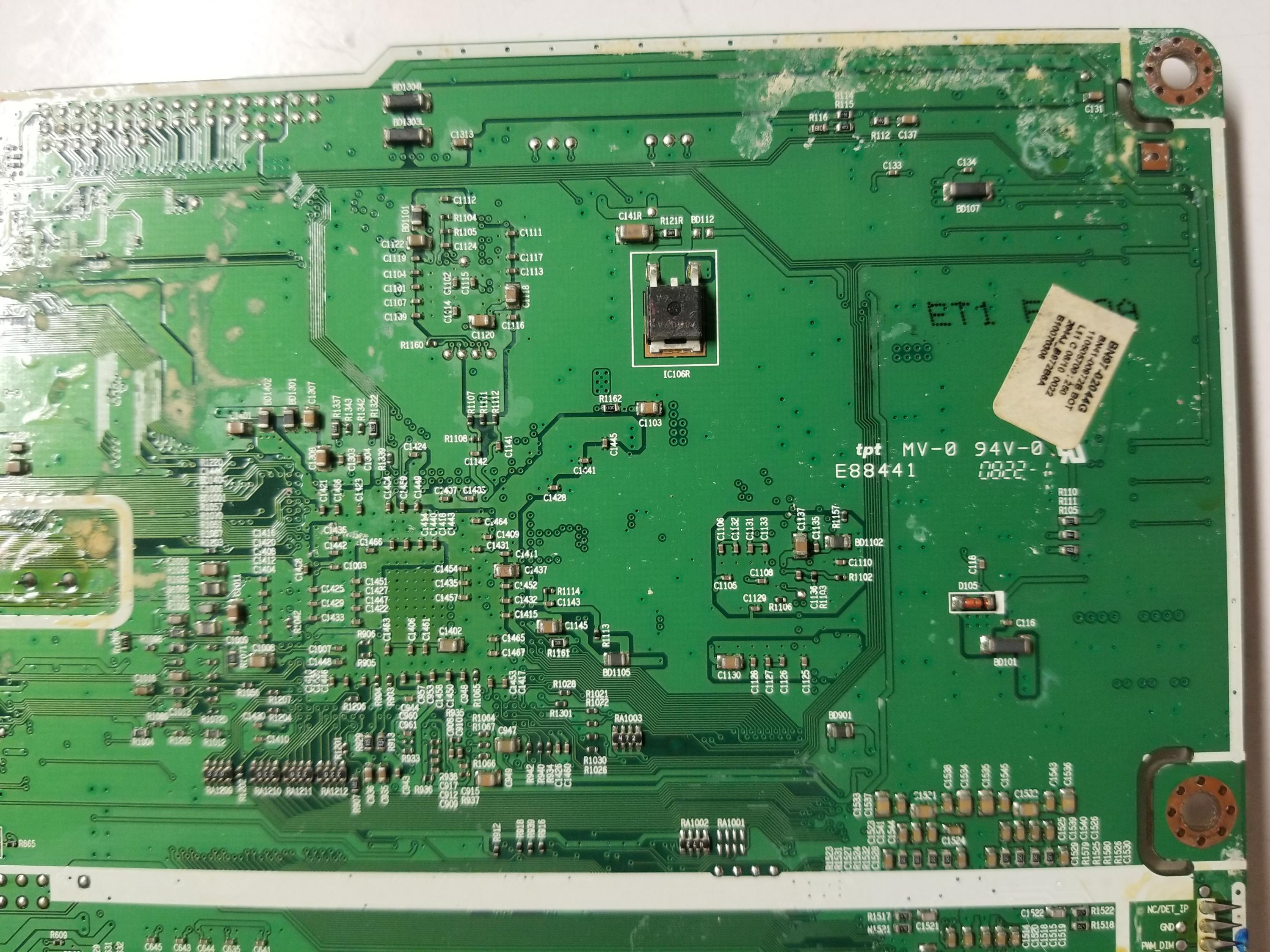 As stated above it just flashes the red standby light every 2 seconds repeatedly, nothing else. Inspection of the PS board shows very high heat in the section to the left of the large caps between the heat sinks. Nothing obvious shorted. The large cap'(s) voltage is fluctuating from about 190v-220v while standby light flashes.
