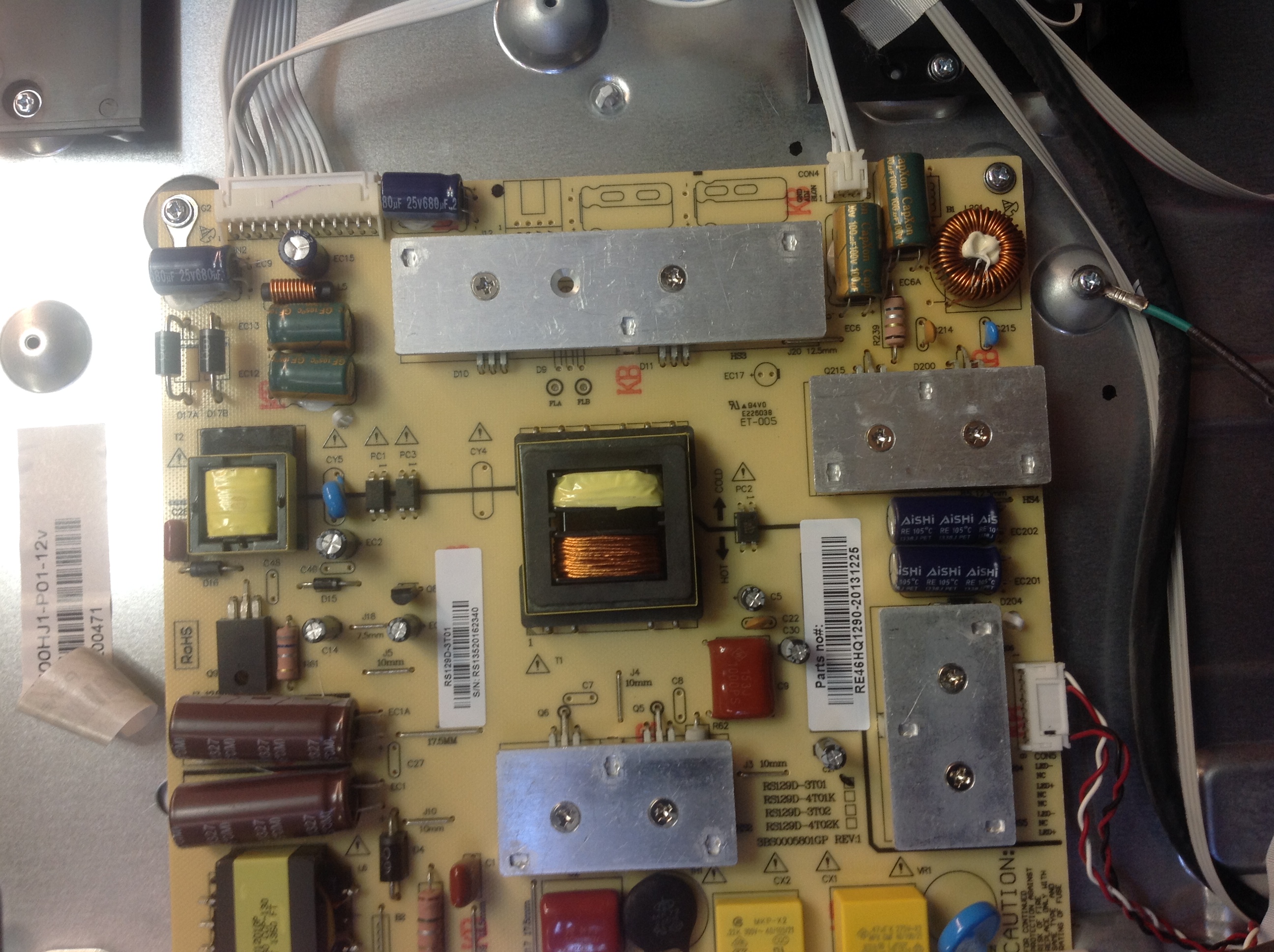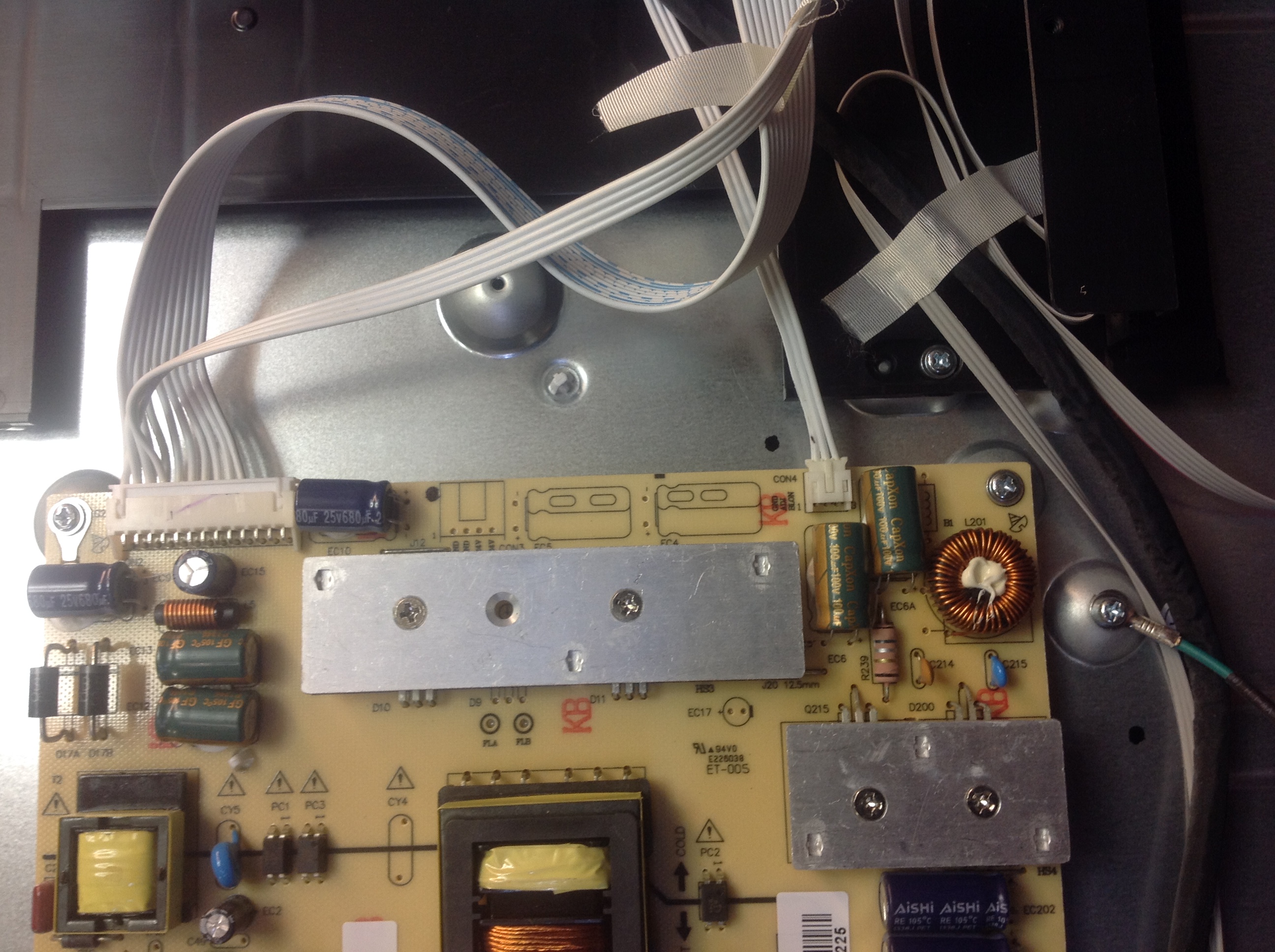 Customer brought in RCA LED50B45RQ and said they had sound but no picture. (I forgot to ask what input they were using as I can't get any sound, that's for later). The red led will go off when power button is pushed and go on when pushed again. The voltages coming out of CN02 to the main board have all the 12v,5v and 5vstb when power is pushed. But I have 0v on the legs of EC201 and EC202. And therefore 0v on CON5 going to LEDS. With the connector on or off to CON5, there is 0volts on the PS board. Bad PS board?