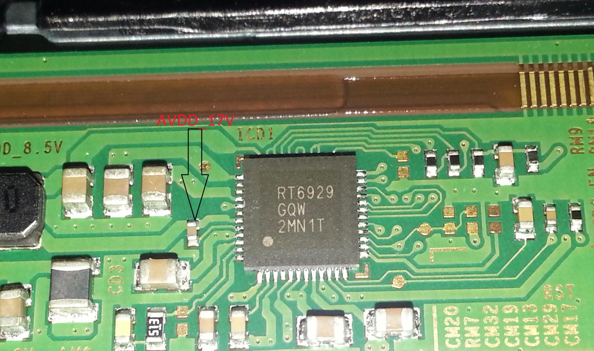 Others were lucky enough to have a shorted SMD cap somewhere, but I wasn't so lucky, that's why I said my issue is slightly different. AVDD_17v corresponds to the pin I marked on the close-up of the RT6929 IC which I believe is faulty and the reason it's not firing up, even though it does generate its 1.2v and 3.3v correctly, though those may be handled by another IC further to the right, not showing up in the pictures.