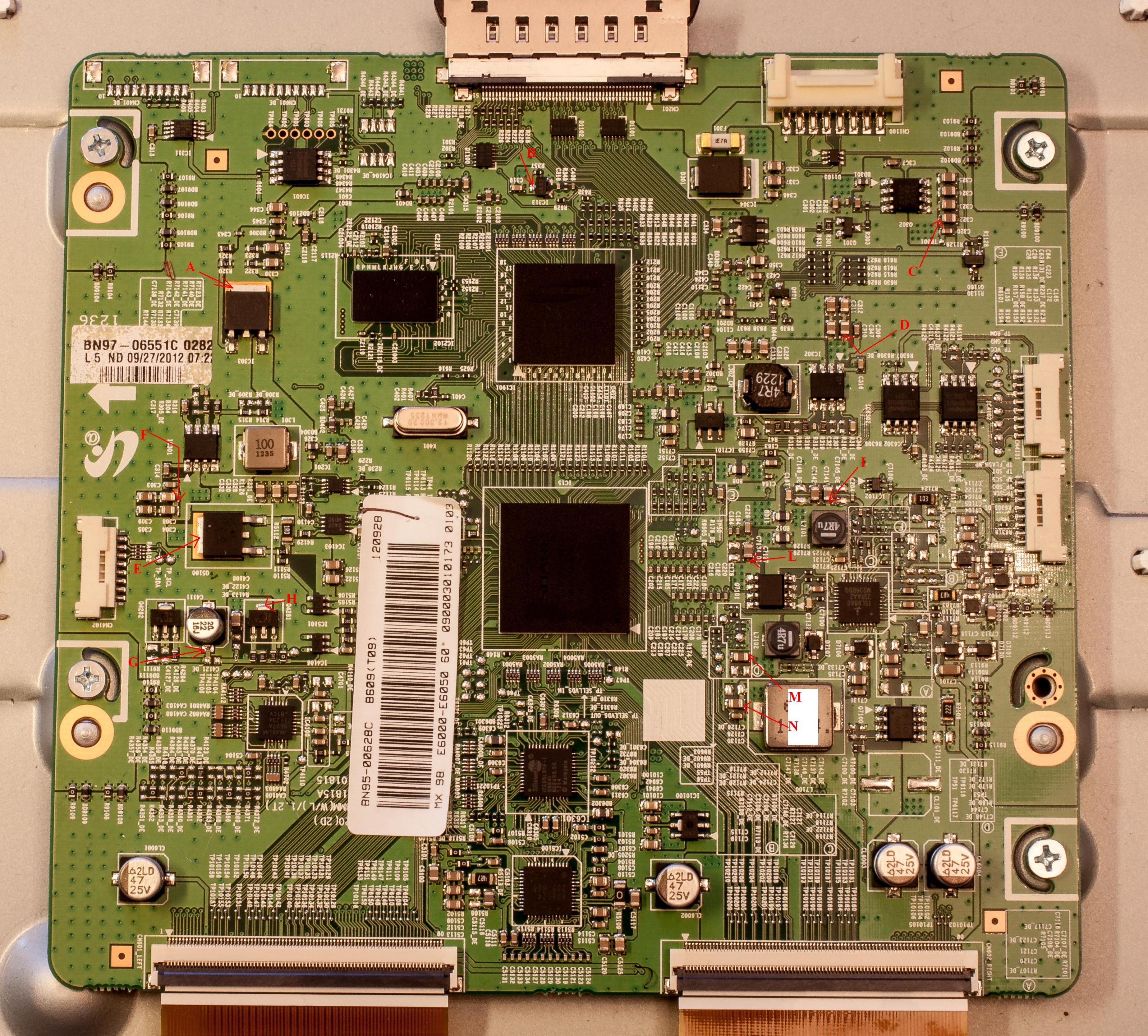 Here is a high resolution image of the T-Con board (BN95-00628C). This image gets compressed in the translation. I also put a copy of it on my google drive so you can get the full resolution image if you need it.