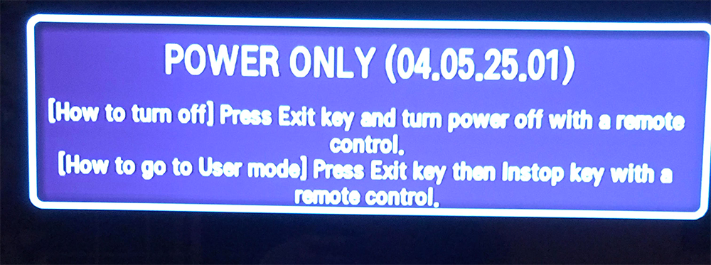 Right, normal power button from remote causes flashing emblem, power button on the tv doesn't do anything. The power-only command gives me the click, and this picture pops up. If I follow the instructions for user mode, a white screen pops up, and my tv shuts off.