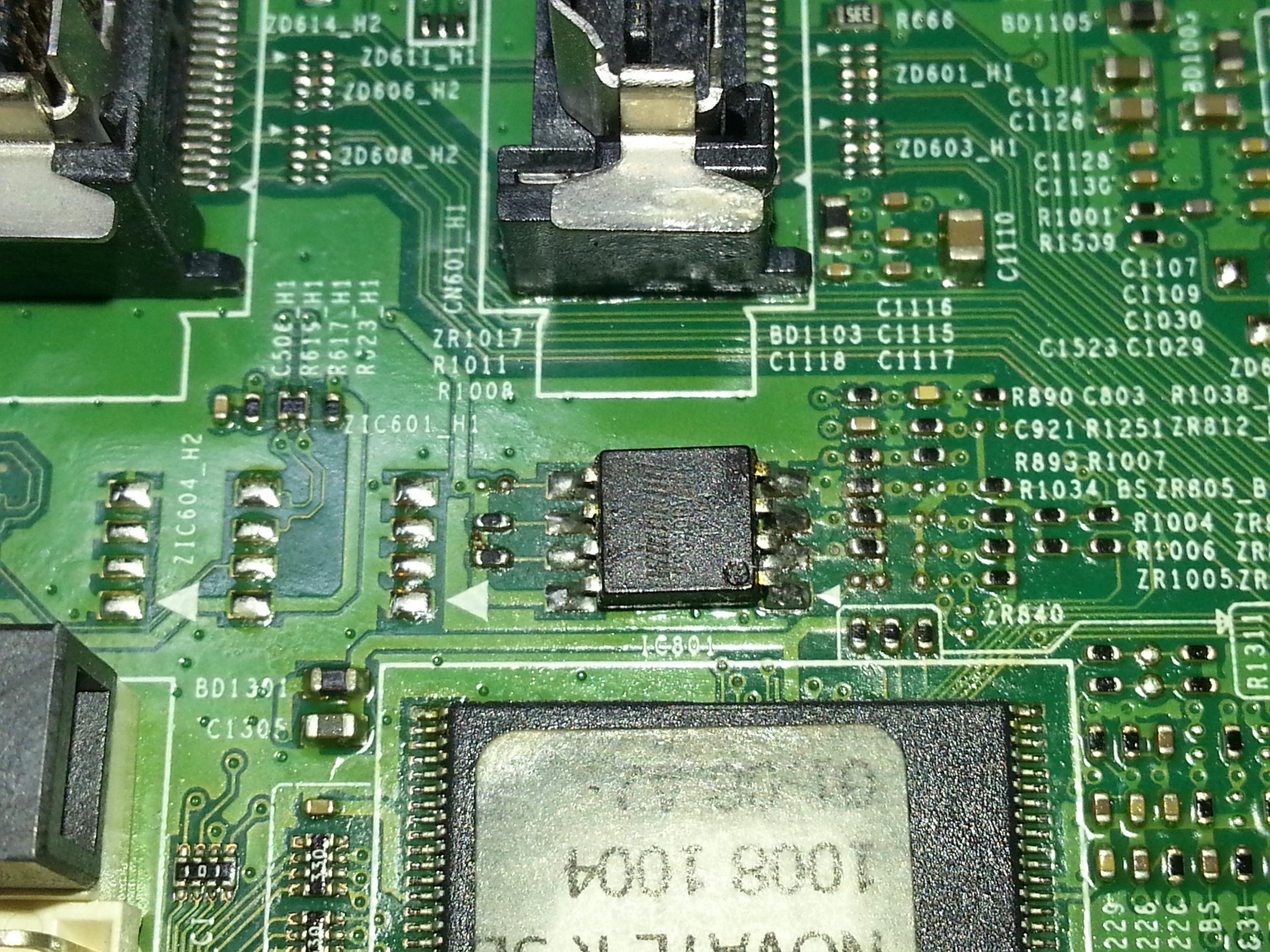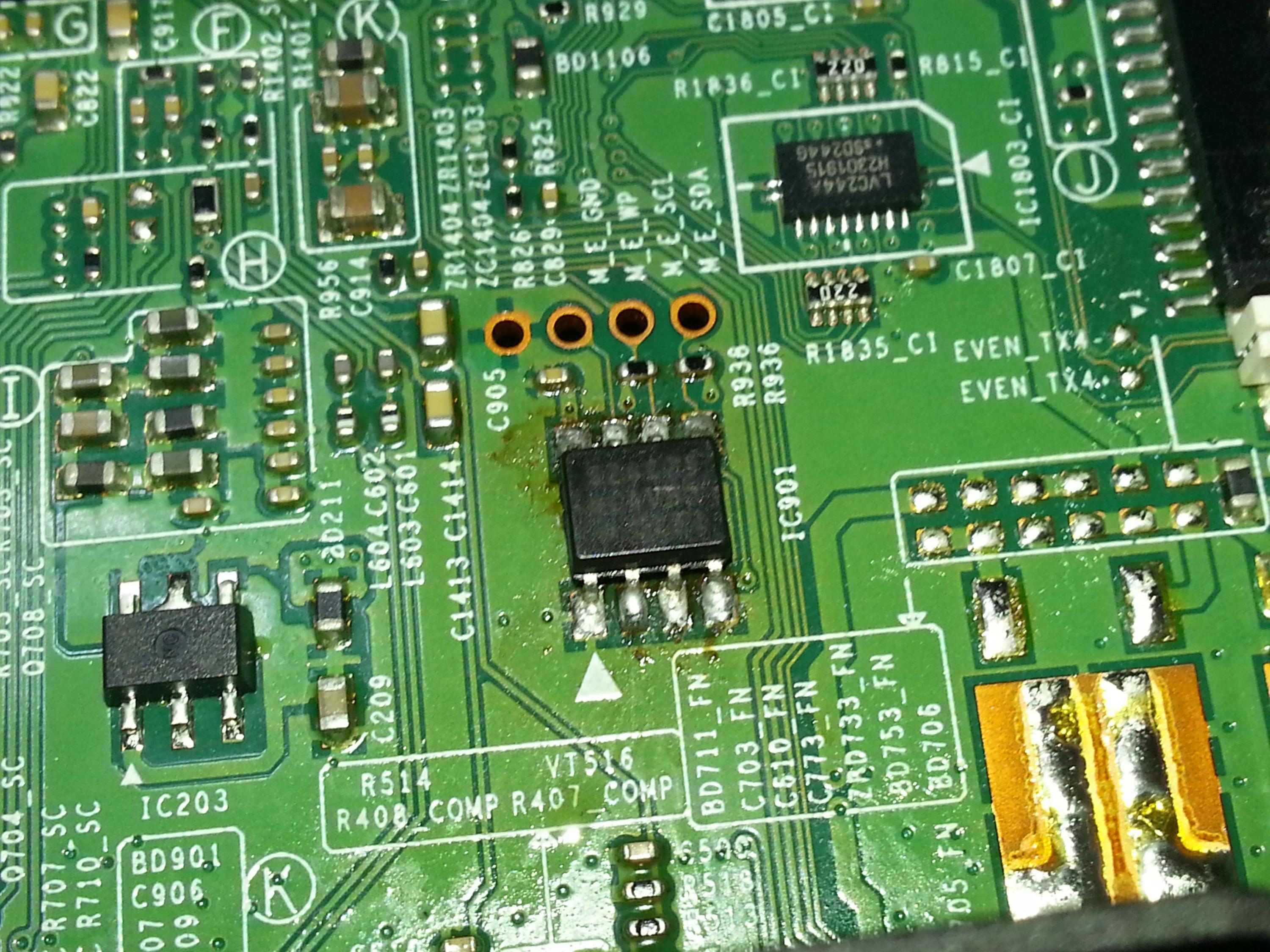 Good day folks. Some advice is required on this Samsung UE32eh4003 telly: the LED blinks 5 times then goes off before blinking 5 times again and so on. Since the power supply checks fine and the backlight comes on without the main board connected, I turned my attention to the firmware: there's two chips on the board IC901 and IC801. IC901 is an S24c25 EEPROM and IC801 is a Winbond 25q40BV.