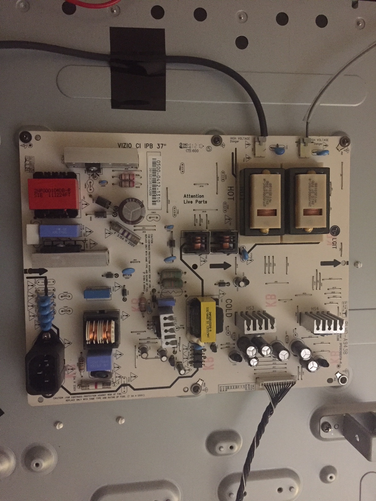 I just picked up the tv. Looks like there's more to it. I turned it on and the orange Visio light went to white but no screen came on. Now I don't see the orange standby light. I guess the psu is toast. I see there is no 12v going to the main from the psu. The caps look good though. Is there any common faults with these psu's?Attached Filesif you find these attachements useful please consider making a small donation to the site