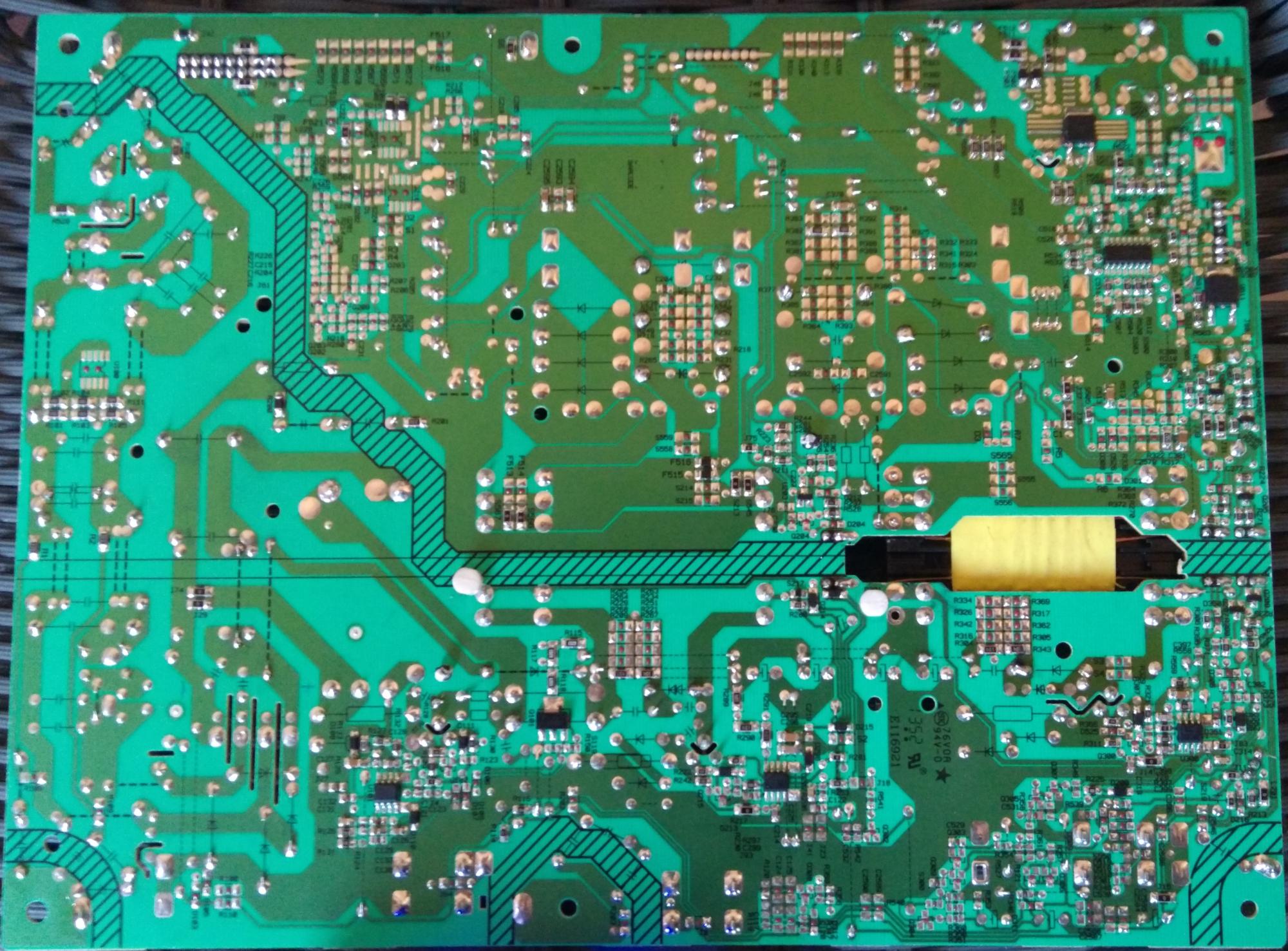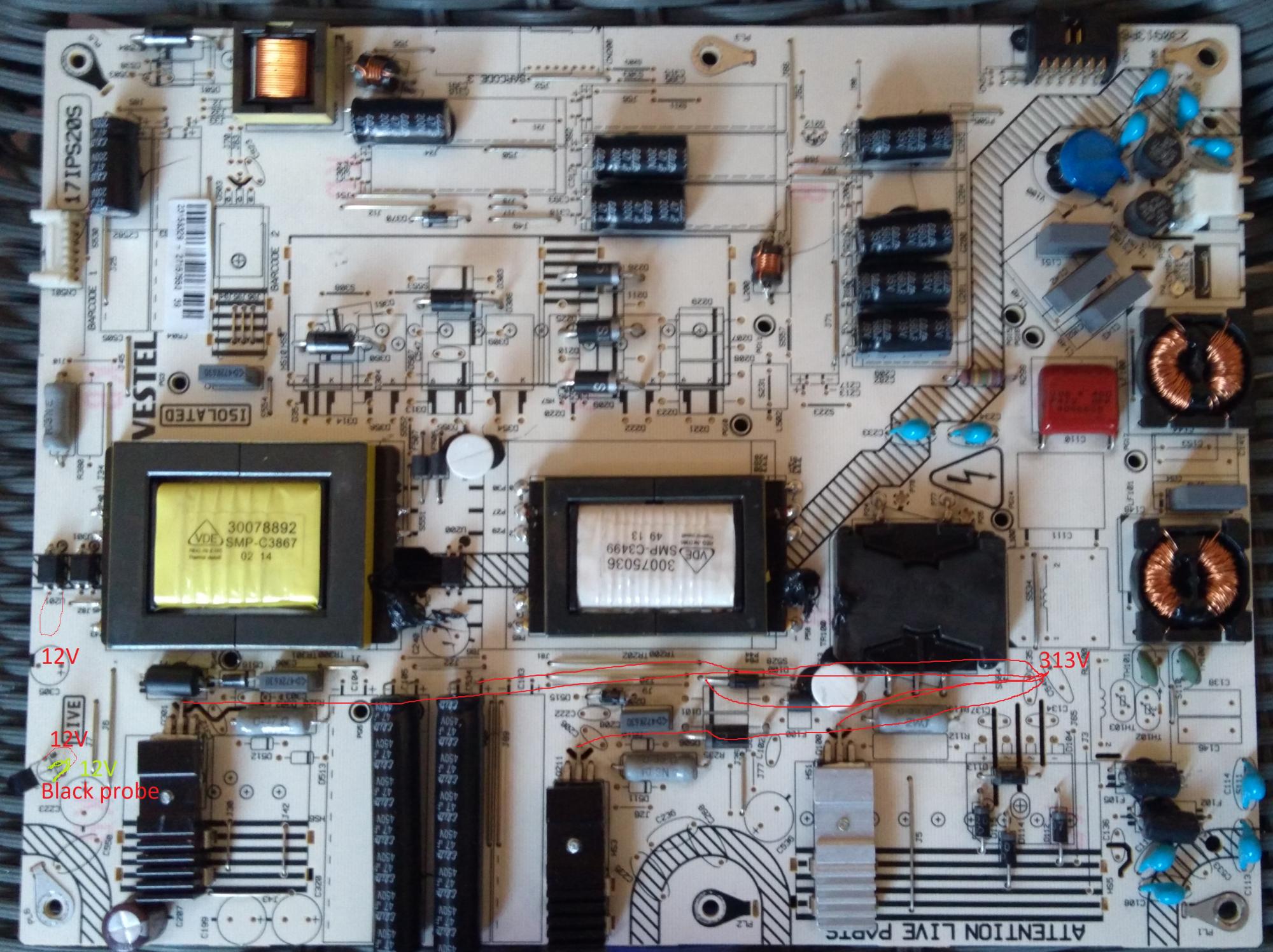 I have a problem whit vestel PSU, no stand by (led on front not working), all is dead. The tv is completely dead , no lights at all, i have checked the all the diodes, they are all ok, all fuses are ok, i have changed Q216, U200 and U301 no luck. In image "frontMes" i have marked voltages on primary side, on main caps voltage is 315V, i don't have VCC, but i have VCC_main 12V. Any advice?