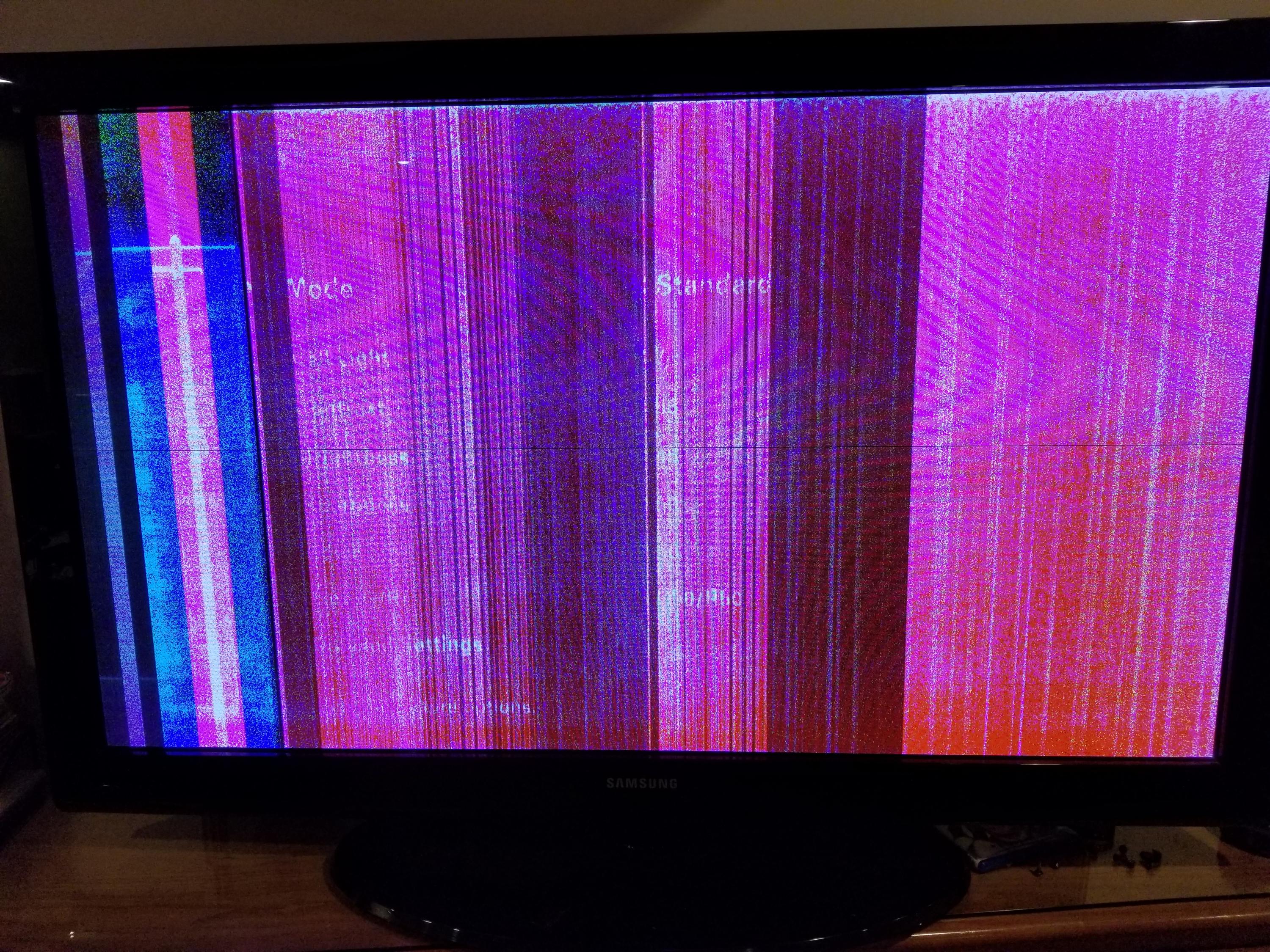 Since this was a known issue, I didn't try to power on the set when I first received it (assuming there'd be no picture). I've gotten a replacement remote and upper and lower Y sustain boards off of ebay (ShopJimmy was out of stock). With the y-boards installed, the set starts right up (plays a little jingle sound, and some blue and green random pixels flash during startup). After "boot-up" is complete audio sounds fine (from either an antenna connection or an HDMI Blu-ray player) but the picture is heavily red and white "sparkly" throughout and unwatchable from both sources. I can't even really make out the writing on the menus that come up. There is also a single solid horizontal black line horizontally across the display.