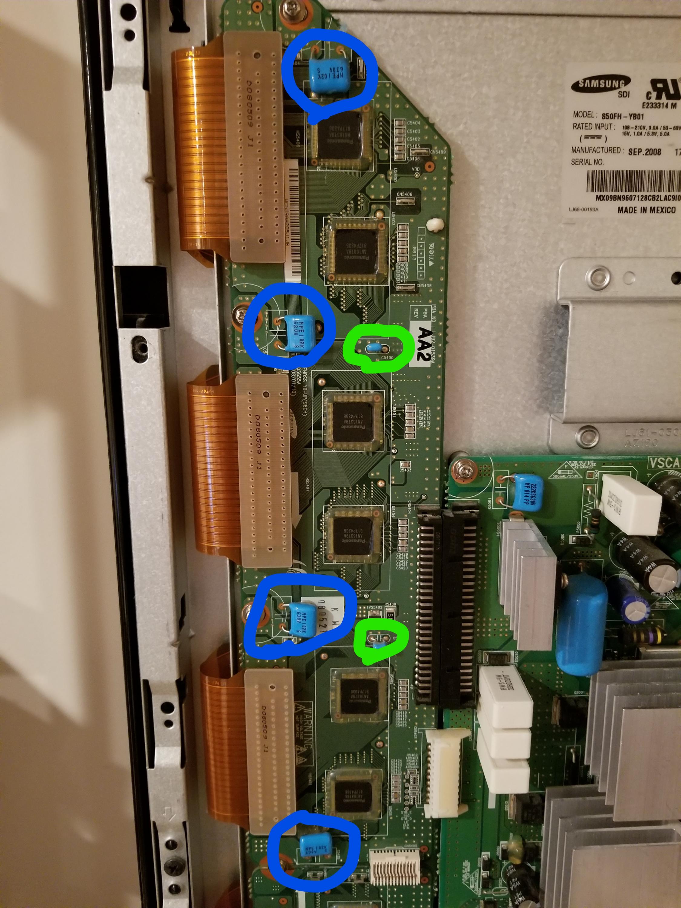I've picked up a freebie Samsung pn50a510p3fxza off of craigslist that I'd like to try and resuscitate. It was known to have blown chips on the Y Sustain board. When I pulled the back off of the set, sure enough 2 of the square chips on the Y sustain upper were melted, obviously blown in what looks like a pretty catastrophic event. Original owner described smoke, and I believe him.