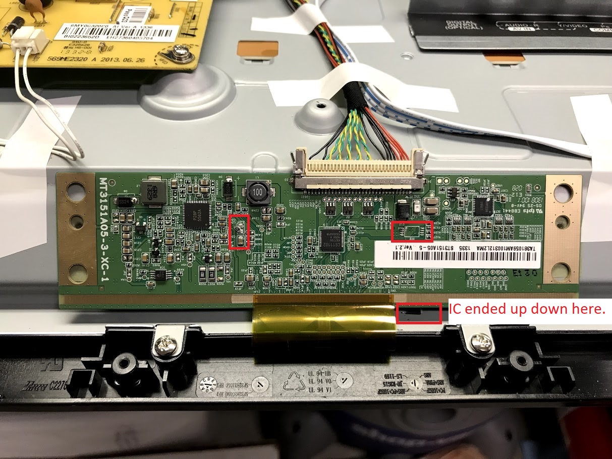 The T-Con has the labeling "ST3151A05-5" which is built in to the CSOT 32" panel. I found the datasheet for the panel, but no schematics for this T-CON. The panel flex cable is bonded to the T-Con so i can't just replace the board.