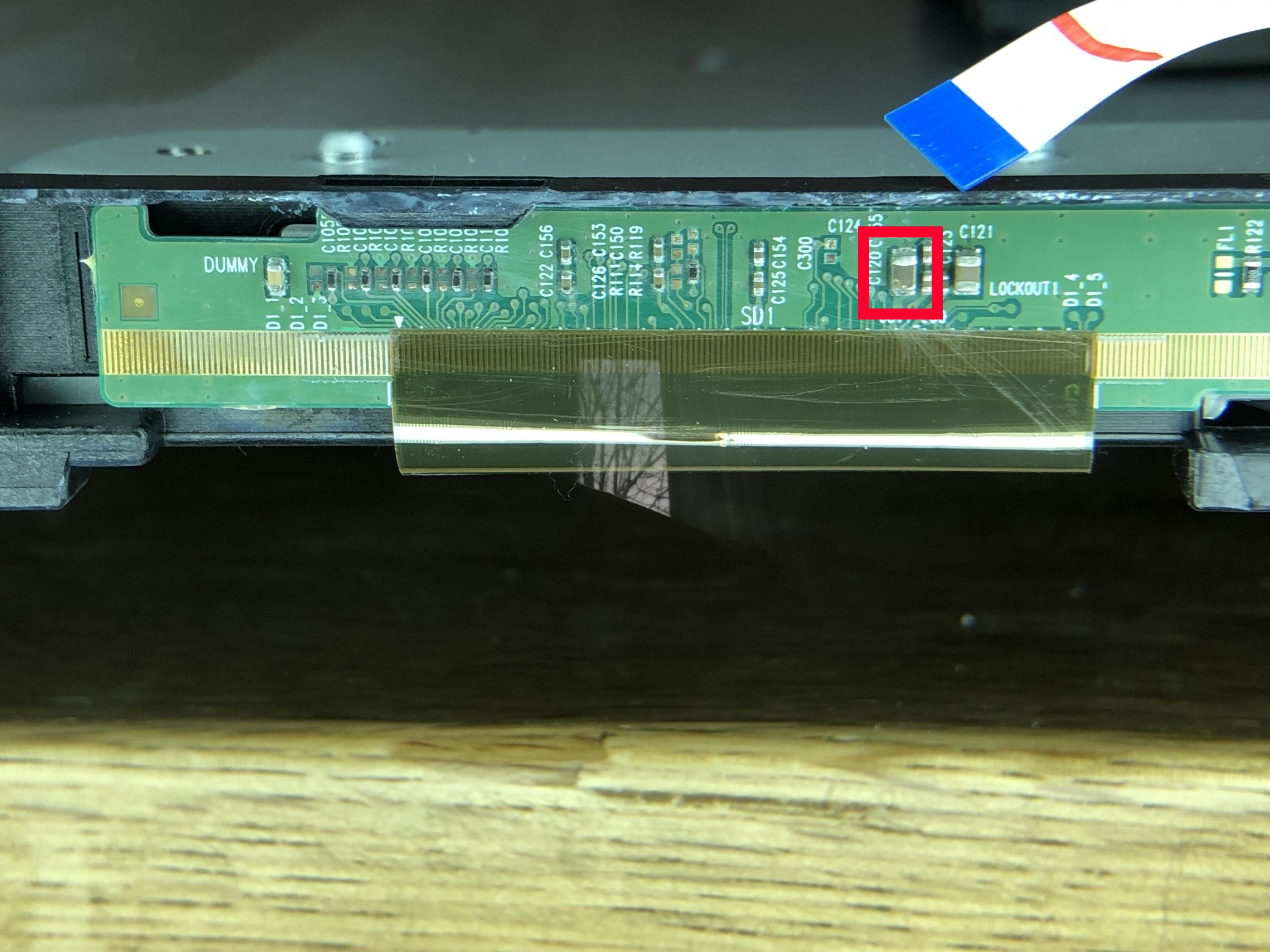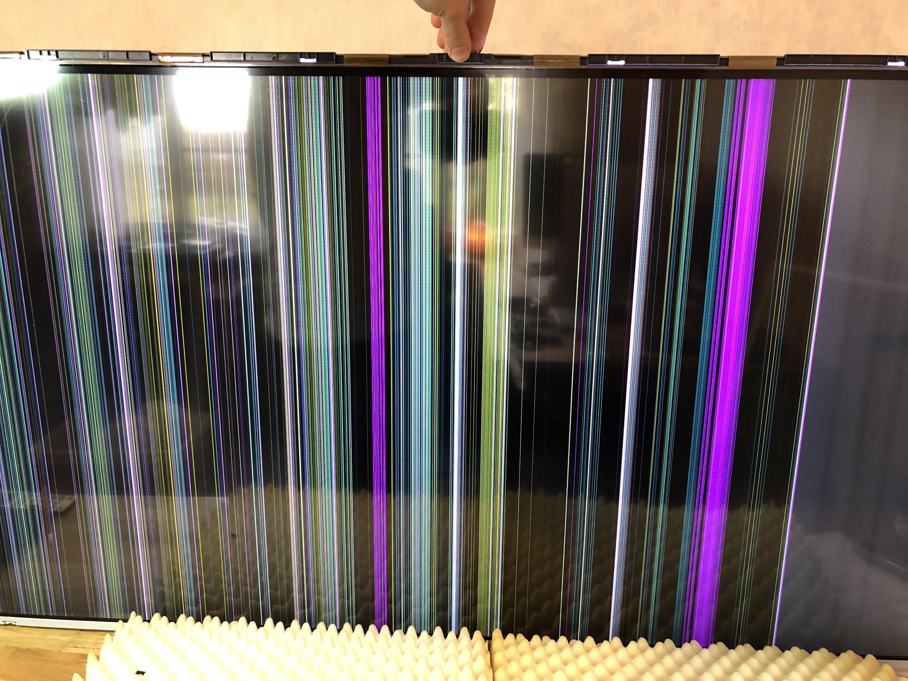 A capacitor on the right thin Panel Board had a short. When I disconnected the right side of the T-Con, the right side showed white screen and the left side showed colored vertical lines.