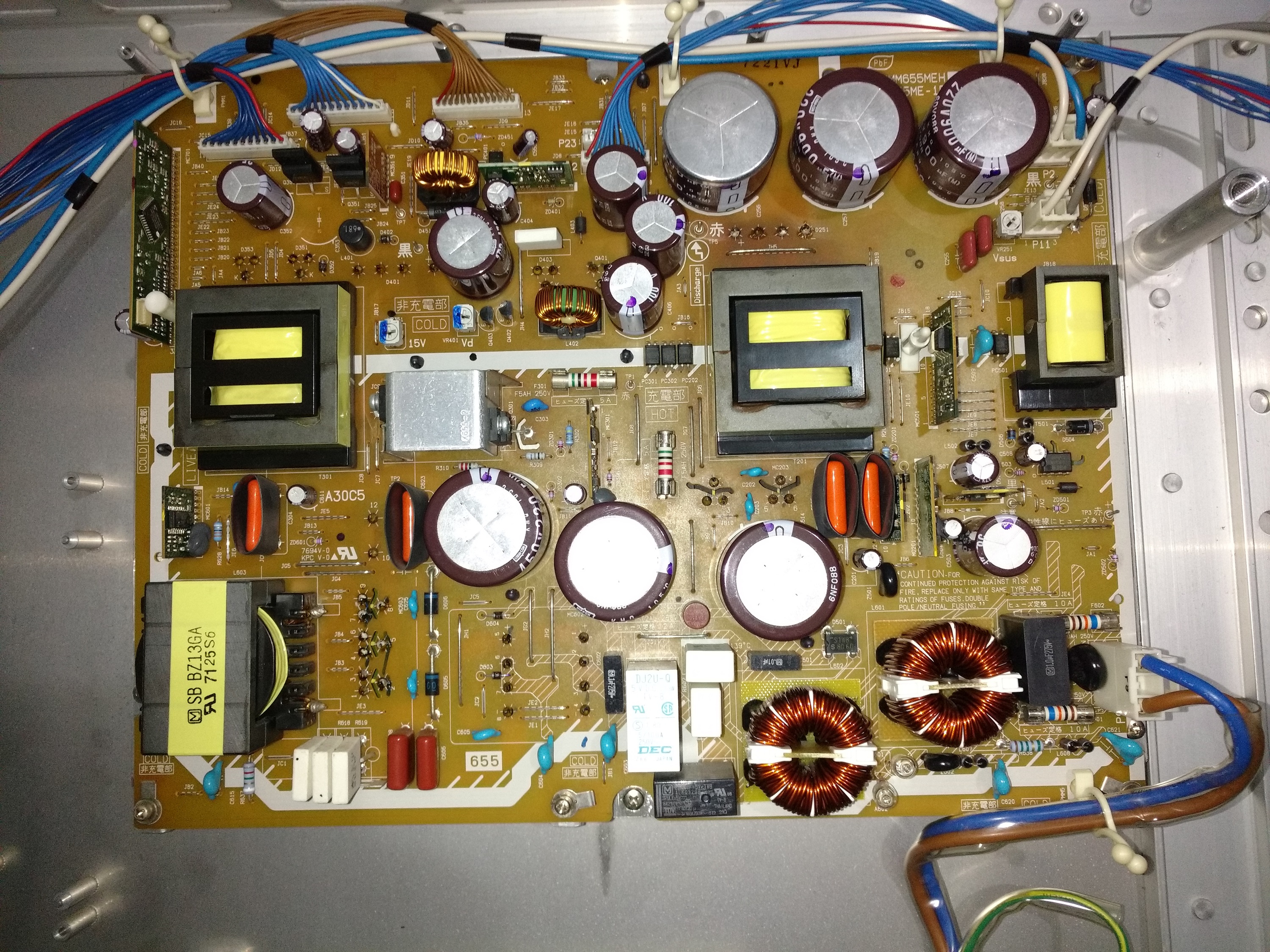 The EMC-filter,fuses and relays on P-BOARD are 250V,all the electrolytic caps on primary are 450V,transformers are the same part-number as the 50PV70LB.
