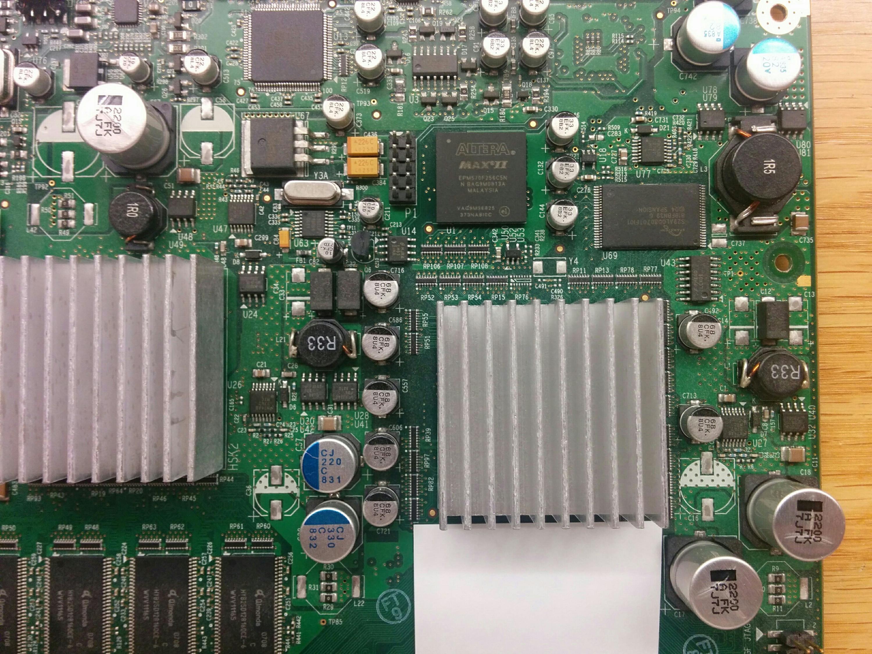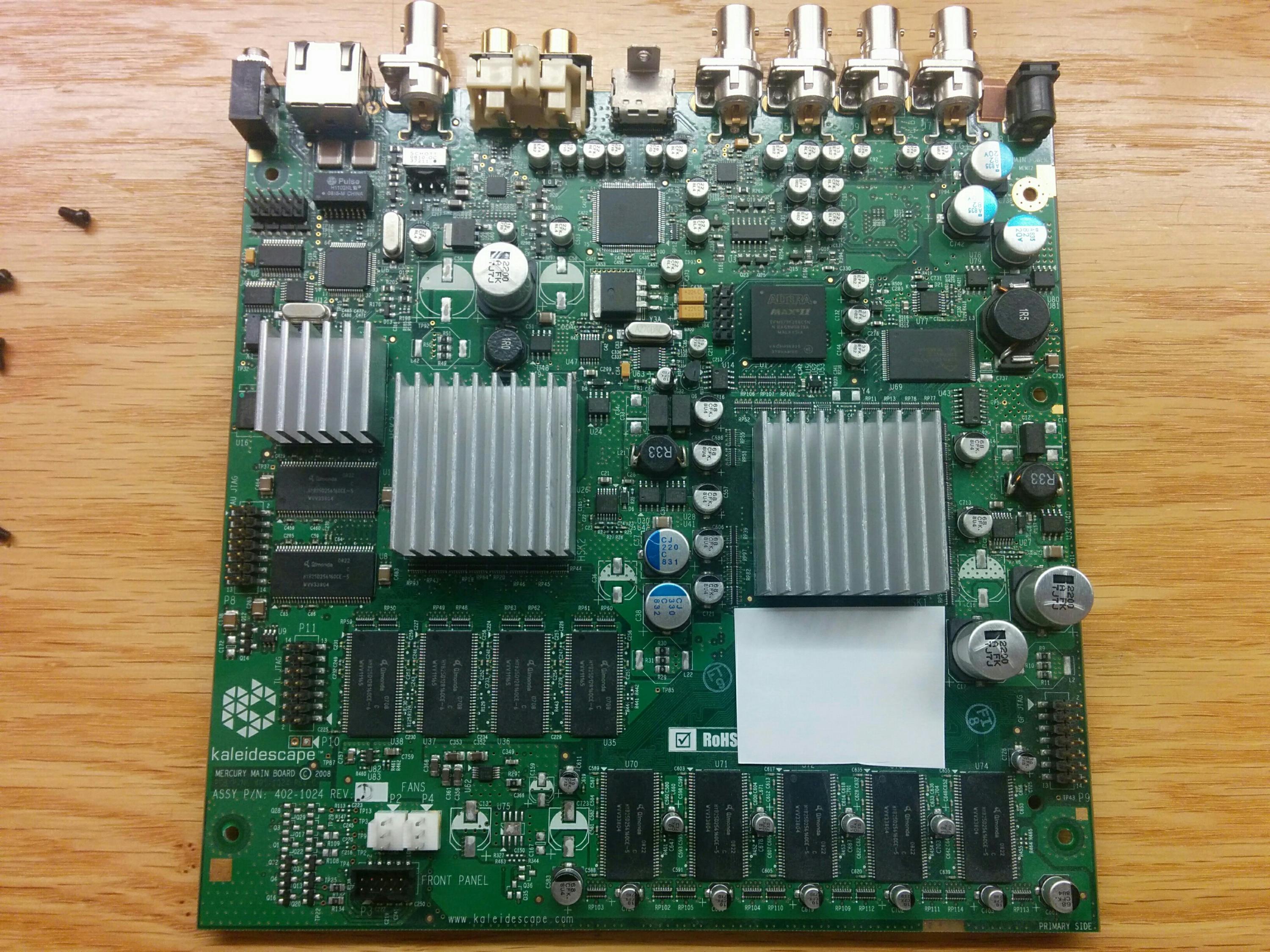 I just got in a Kaleidescape KPlayer-300. It works for the most part, other than randomly rebooting several times a day. I took it apart and it seems to have several bad capacitors which could explain the symptoms. There are 3 2200uf caps that appear to be Panasonic and are slightly bulged. In the third picture, I am holding up a new Panasonic FC cap next to the board. The medium sized 220uf and 330uf caps look like they could be bulging also.