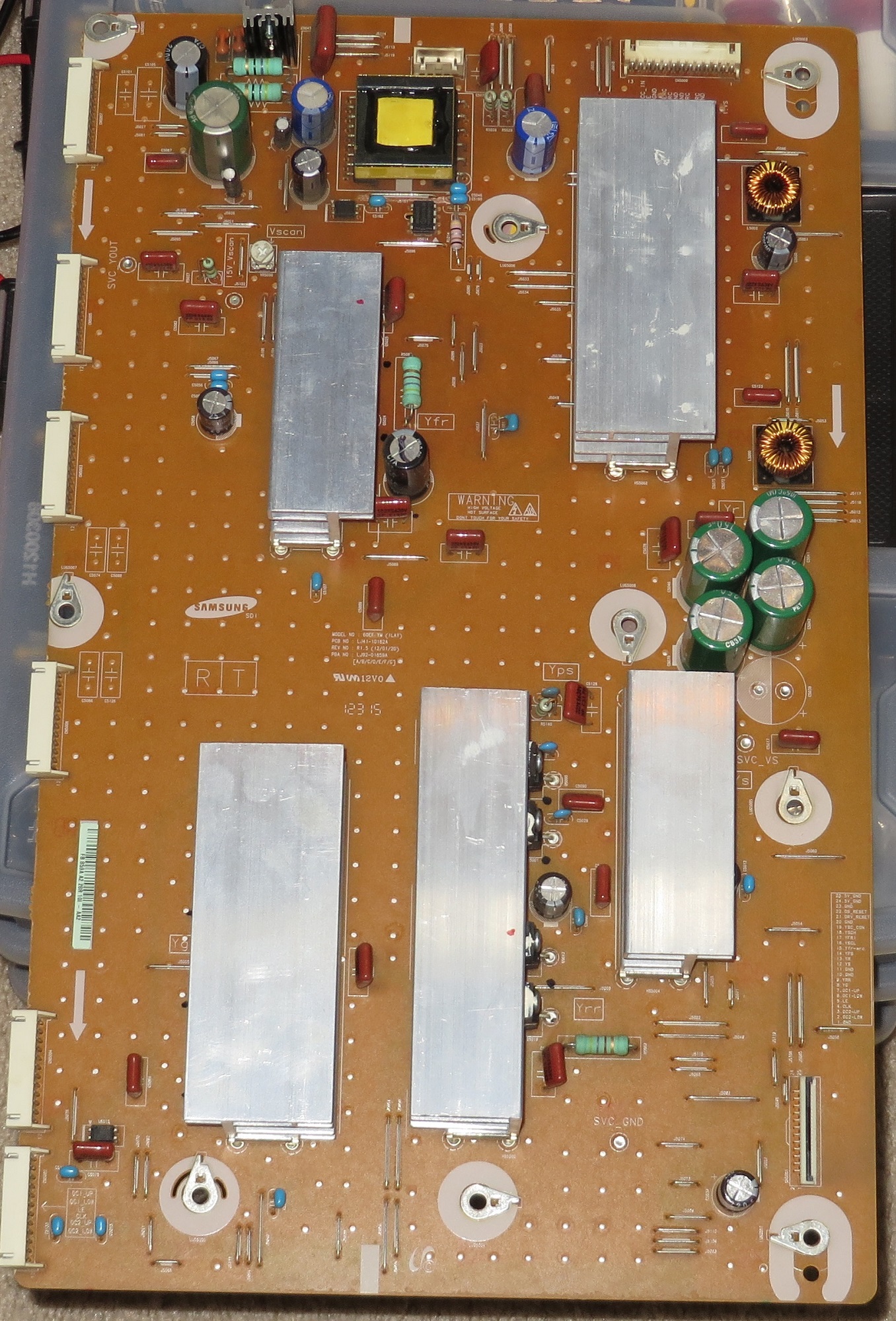 This is a Samsung PN60E530A3F Plasma. There are several threads here on this TV where the startup sound will play but there is no picture. This TV did have that problem, but before I could get around to applying the fix that I found here on this forum, a nearby lightning strike made the problems worse. Now the TV will not respond at all. The only sign of life is the blinking green led on the logic board.