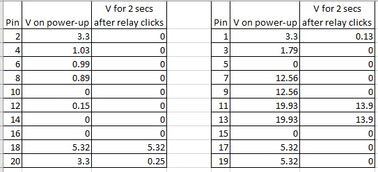 On CNM803 I get 5.34V on pin 18 and .25V on pin 20. Nothing on any other pins.