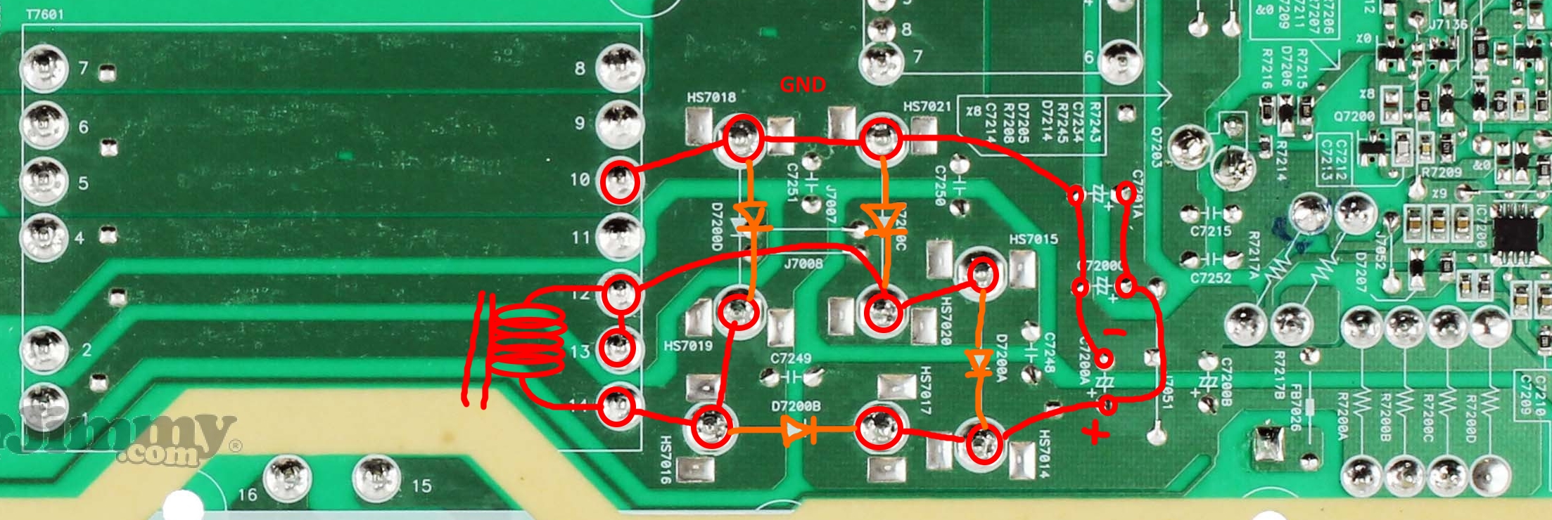 i removed d 7200 a and b shorted both ways.Im not sure about 3 connectors on cold side what your referring to?The cold side from what i can tell feeds power to hot via t7601.Then various levels of voltage sent to different sections.On left side seems run through those 4 diodes and then drives l1 and l2 connector.Those 16 transistors drive leds i would assume.