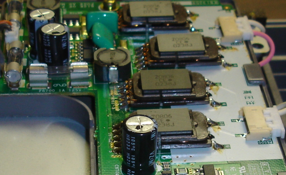 I also see five Nichicon VZ(M) capacitors at 1000uF and 16V with the designations H0233 at 105 degrees C. I also remember seeing a KMG capacitor rated at 2200uF and 16V.