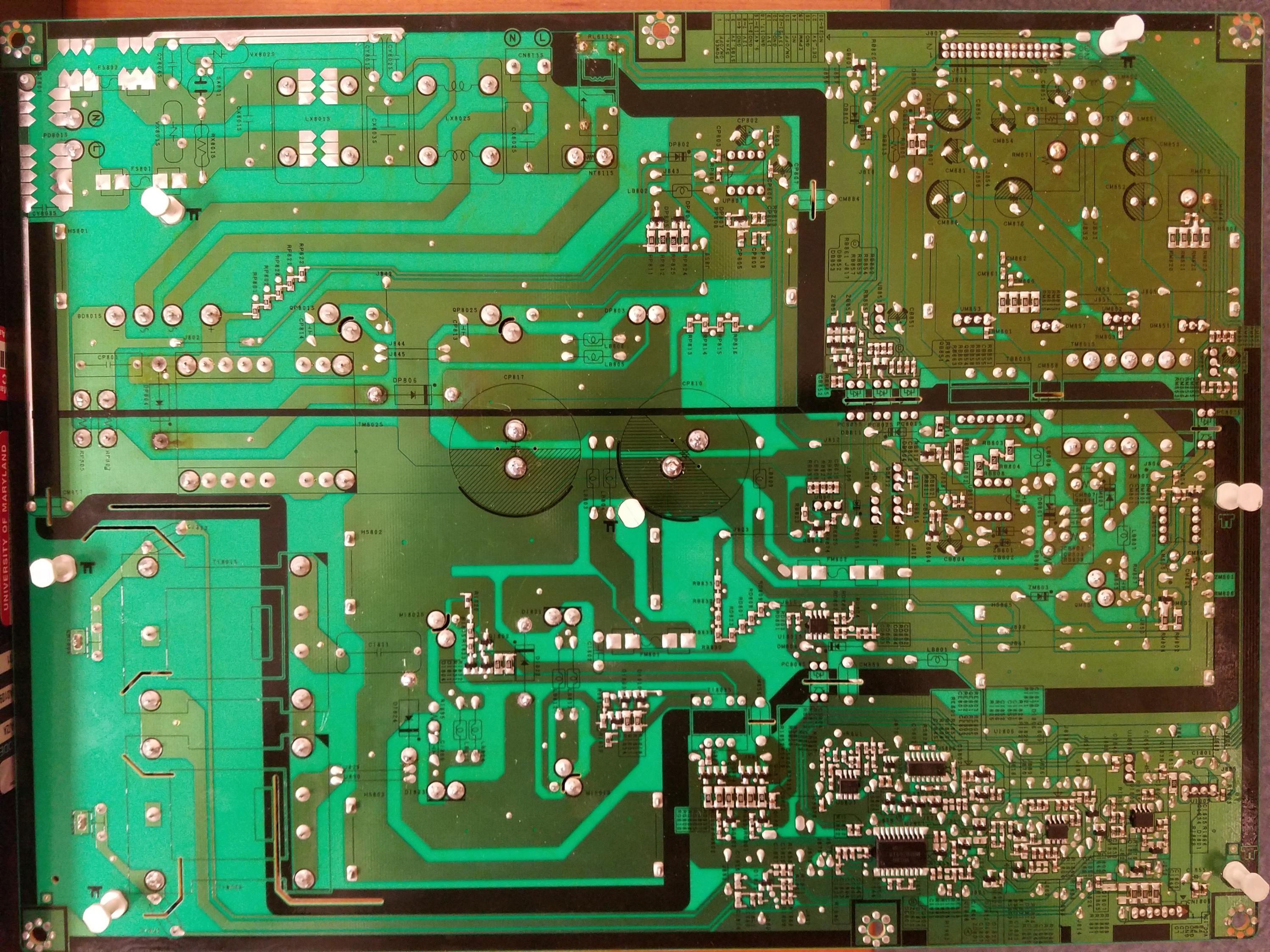 As far as UB801s is concerned, it's a https://cdn.badcaps-static.com/pdfs/...d718dc5d57.pdf Green Mode Fairchild Power Switch. I've replaced the fuses leading up to it and I'm reading ~114V on every single pin on this thing, so I'm guessing that's probably not correct.