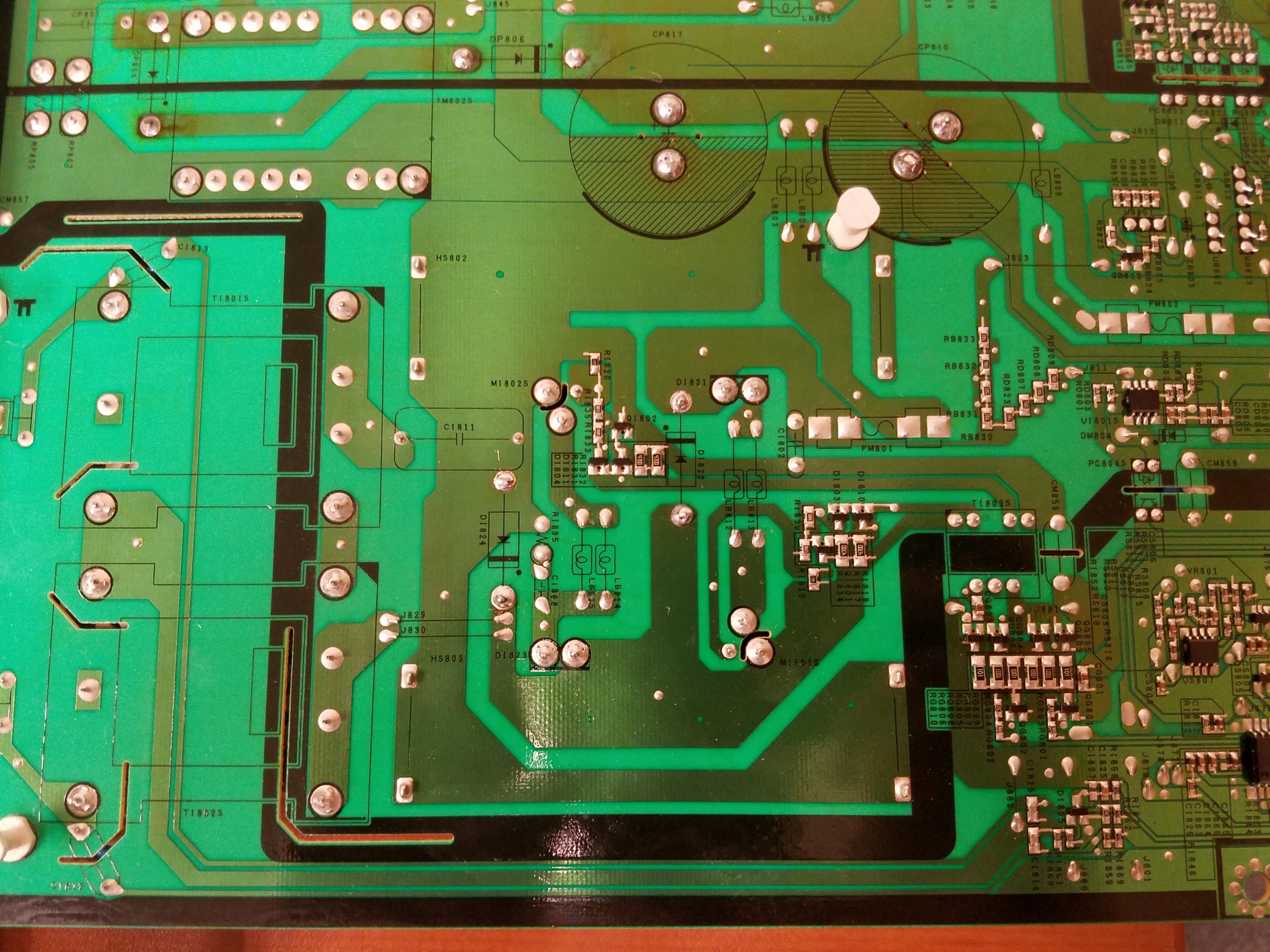 Besides replacing the capactiors, I've removed and tested the ferrite diodes around this circuit which can be seen as having a checkmark by them in the pictures on the top of the board. I chose to do this because there was some discoloration around their solder joints and they must have gotten hot. Another thing to note is the noticeable black squigly mark on the top of the board near the transformer; not sure what that is. And then I noticed a bit of residue or an abnormality around one of RL811S on bottom view of board.