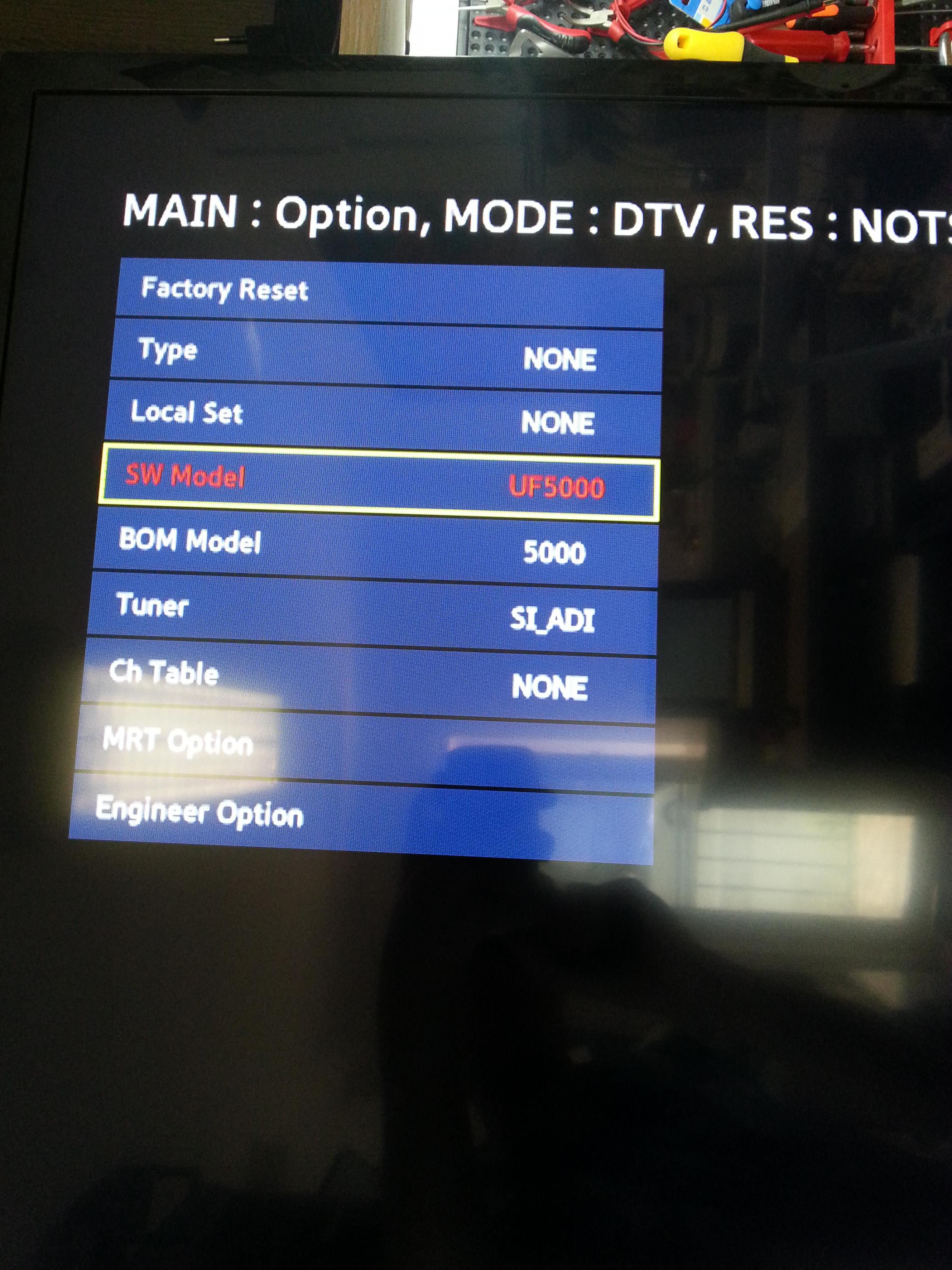 I set the options and the TV was all ready to go.Back to our case, if those options are indeed locked (though I don't see why they would be), you may have to do the extra step to unlock them. Once you do, you only really need to set TYPE and LOCAL SET, since SW model is already set to UF5000 which is fine and the others shouldn't be messed with (at least I didn't). The LOCAL SET option should be set to whatever region you're in...mine is EU so that's what I set it to (just EU, no other country after that, since there are options for individual countries). I imagine if you don't set the region right, the tuner doesn't pick up anything...not sure.