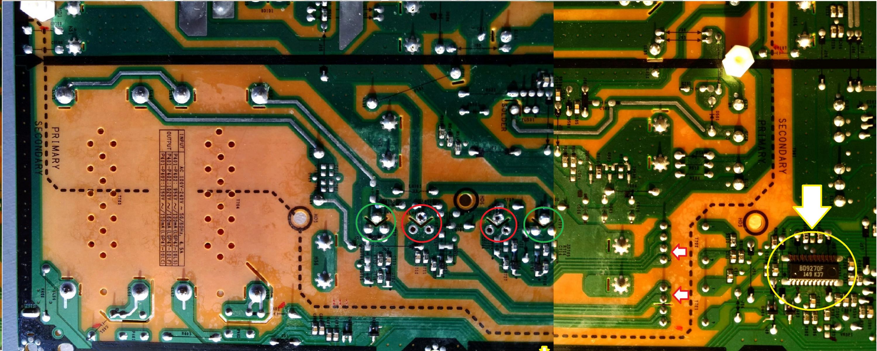 I checked voltages and appropriate voltage is found at the power to main board connector including INV on/off, 3.2v/0v. The main caps switch from 165V to 395V when the power button is pressed. There is zero voltage at the backlight plug and no voltage on either side of the backlight transformers.