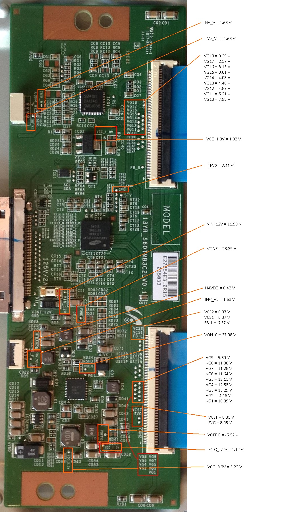 At the supply board I have what I assume is normal voltage for the 21v power on and the 3.3v standby/always on. I haven't really checked anything on the main board because I'm not sure what I should be looking for. It's definitely getting voltage though. Also I had a small crimp in my cable from main to the T-Con(?) but it's no worse the the folds from the factory. I started checking continuity on that but kinda gave up after the 10th pin.