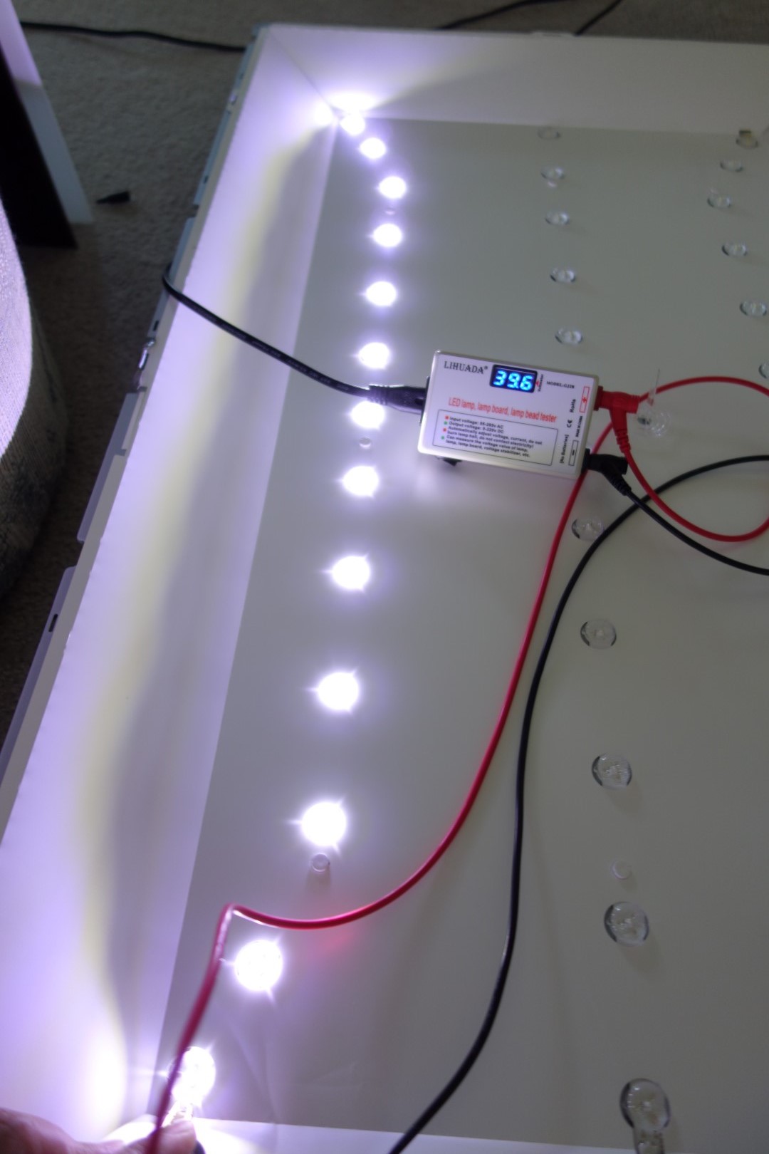 Voltage pairs at connector to 3 LED strings (chassis ground reference). Also confirmed voltages on the LED strip. The three are wired in series.