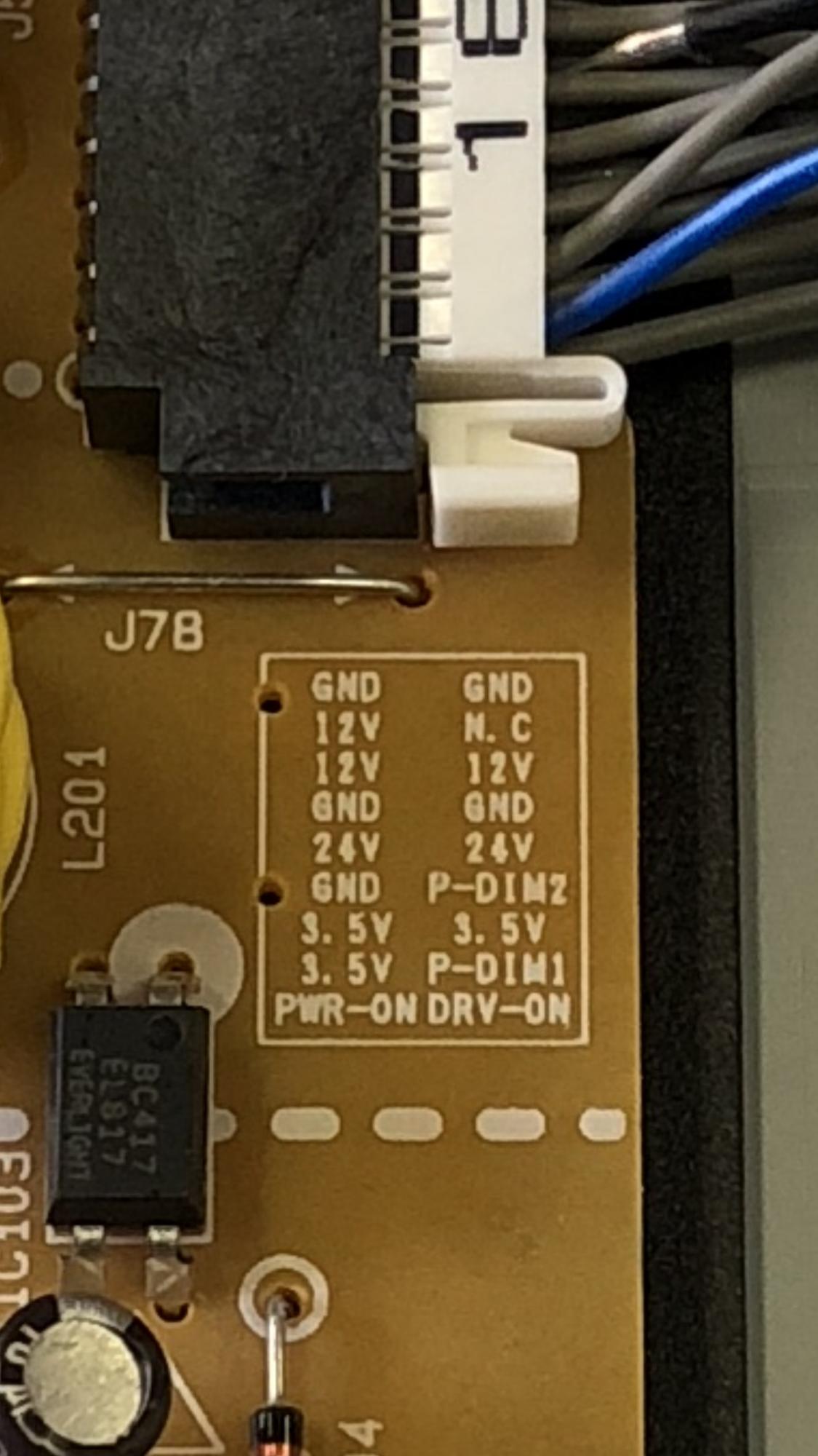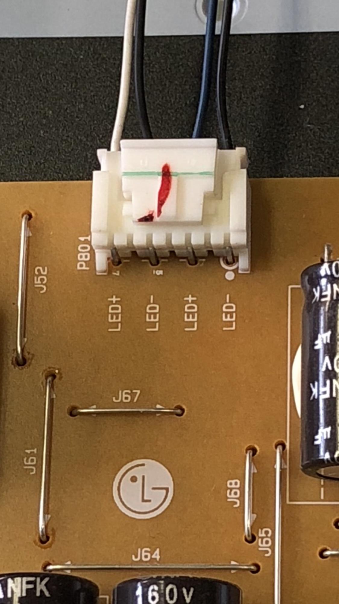What I Have Done So Far: 1) Removed the back TV cover to expose the boards (Power Supply, Tcon, and Main), 2) blew out any dust and cleaned all connections, 3) Noticed that the LED backlights are fed from two separate connectors...