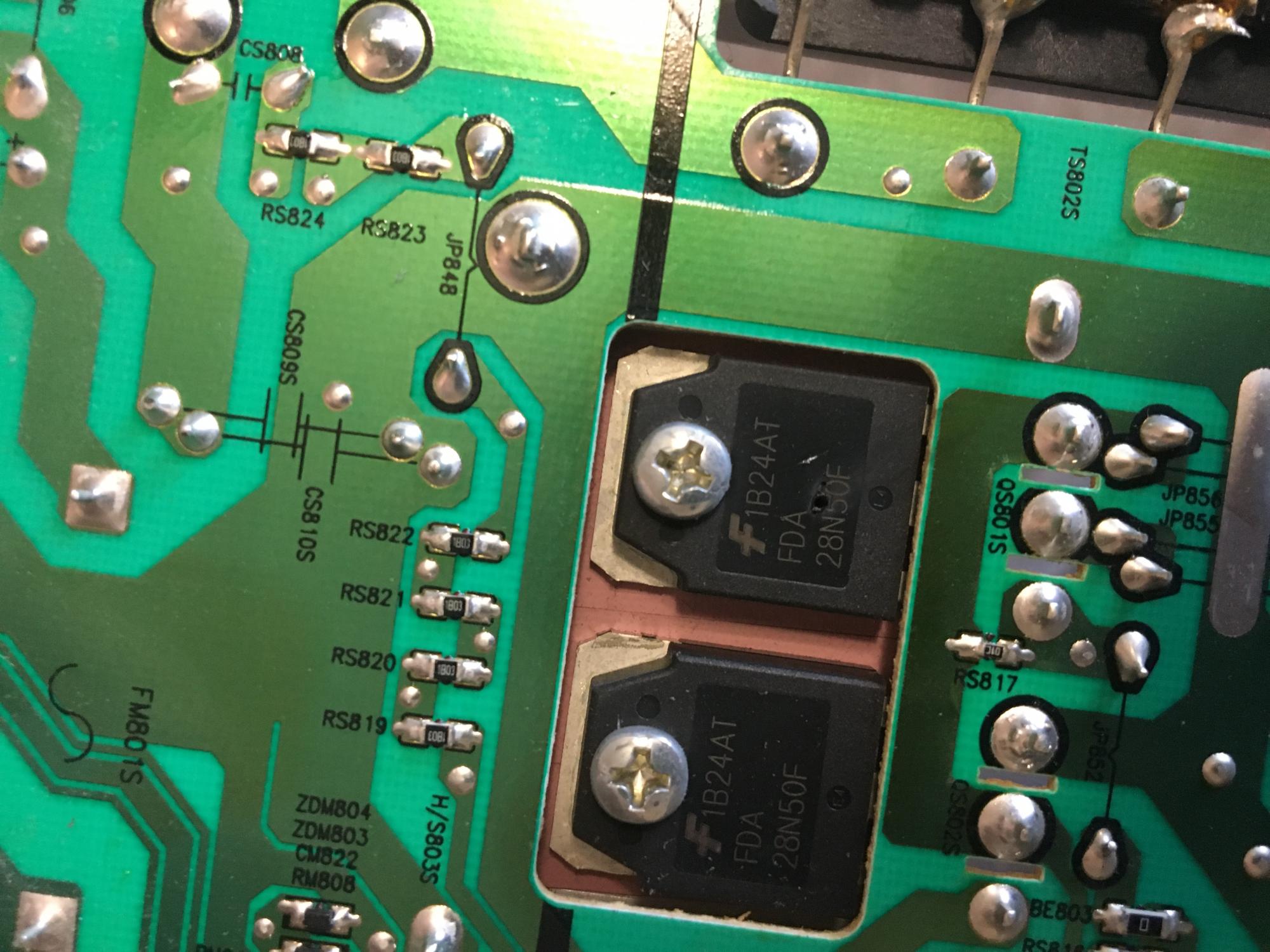 Immediately, I opened the back and noticed that one of the fuses on the board (BN44-00447A) had blown. I thought I could replace the fuse and cross my fingers that nothing else was bad. I replaced the fuse and plugged in the TV, immediately the other one popped. I replaced that one and plugged back in and this time around I heard/saw a pop, which tripped the circuit breaker. This time around, a thermistor blew.