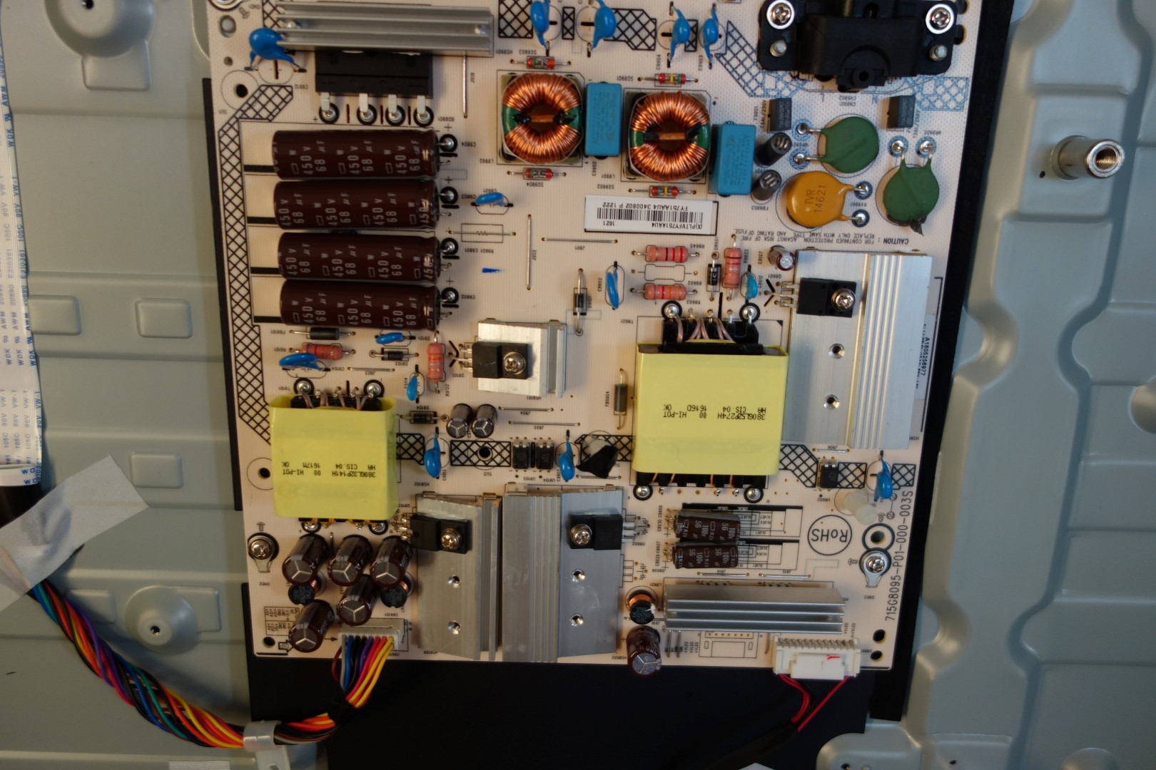 It is branded Best Buy Recycles (Best Buy repaired and resold??). It is missing 2 ground screws on the PS board, 1 ground screw on the main board and both the tcon shield and screws. I borrowed some screws from the cable clips to ensure it was grounded.