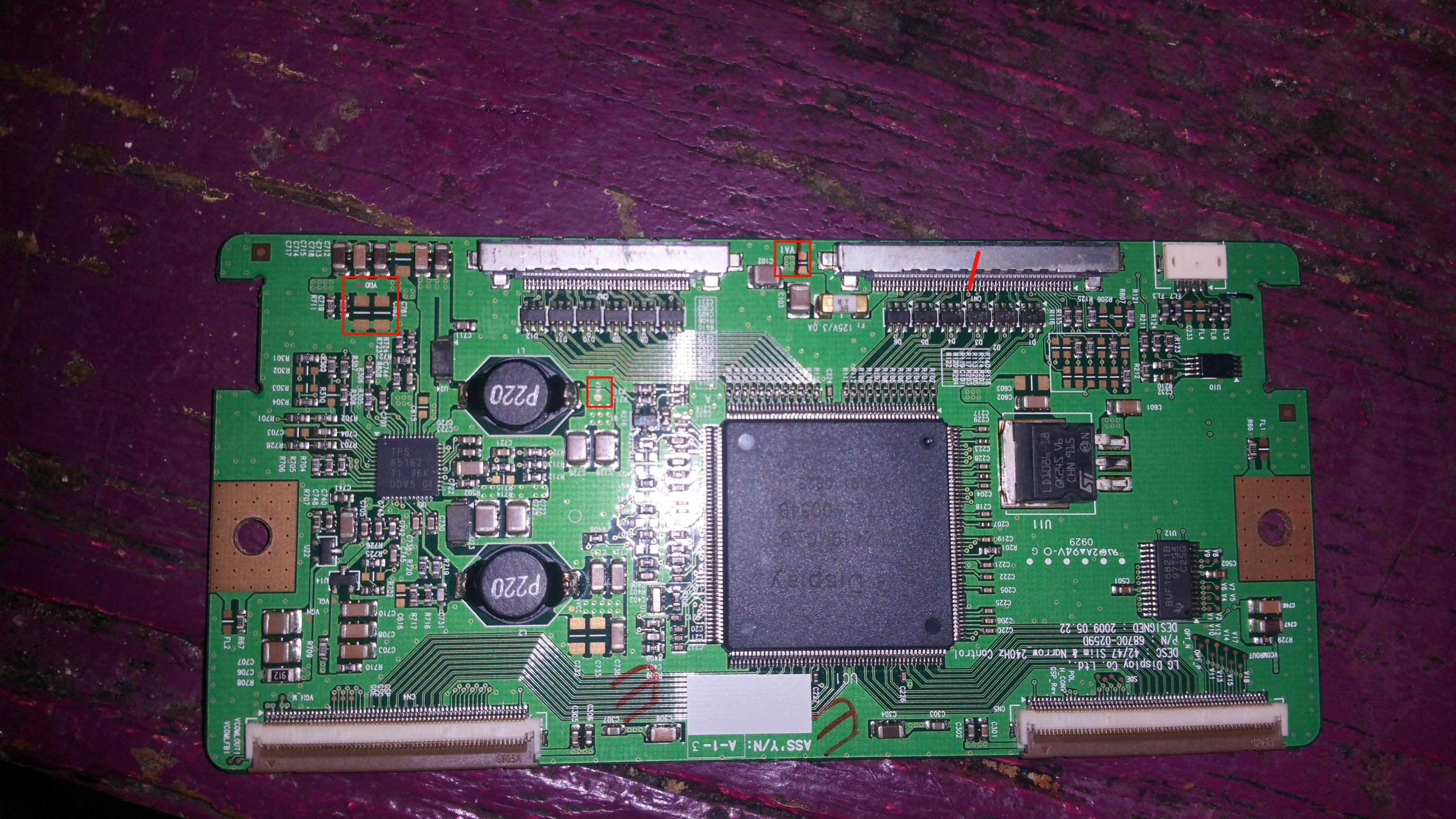 Try cleaning and reseating the LVDS cable at both ends and the FFC on the T-CON Bd. to the Source/Panel Bds. Looking again at your 2nd pic, is the image showing whitish on the screen?
