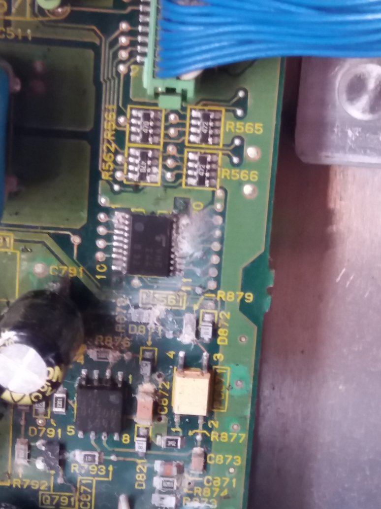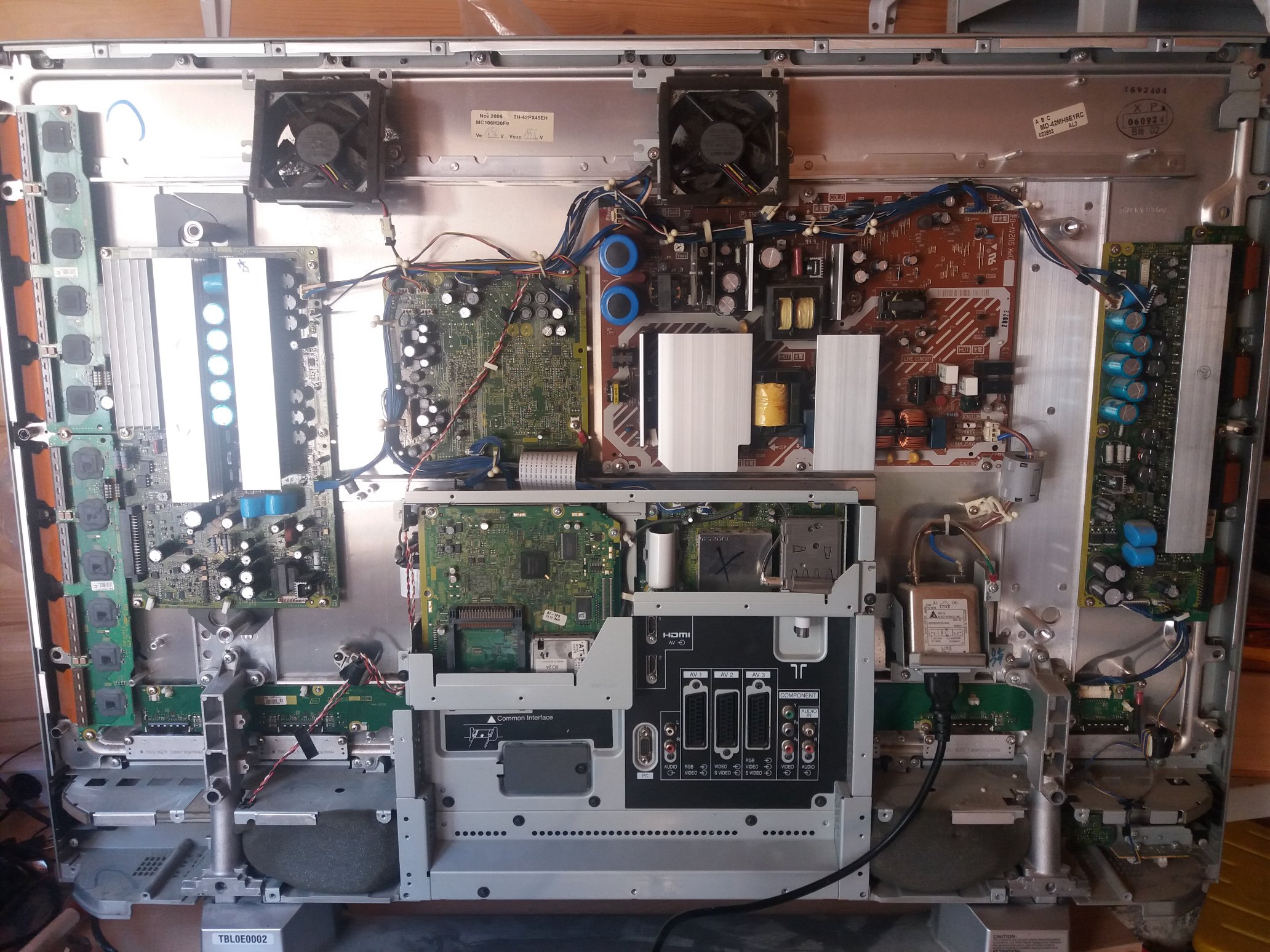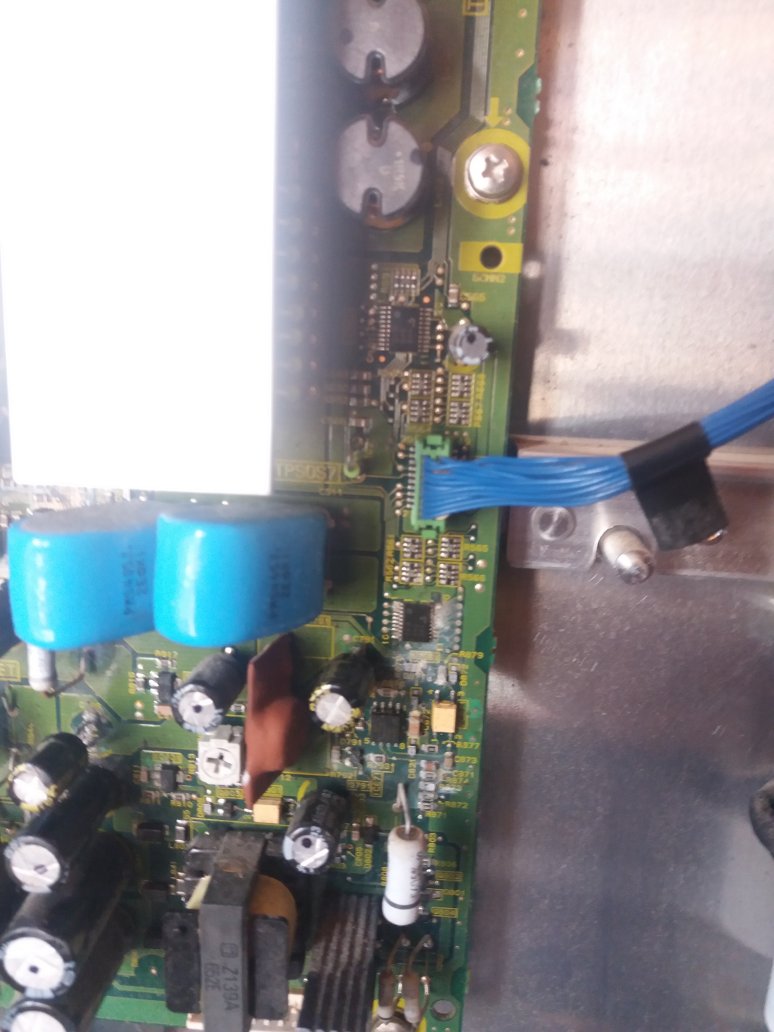 First thing I see is some traces of water in the Y-sus Board, lower right side (see photo). I was so glad to see this, I was already checking for spares online for this board, but first I checked what would happen if I isolate this board, and...nothing... I disconnected all the wires to this board and the TV would still do the same.
