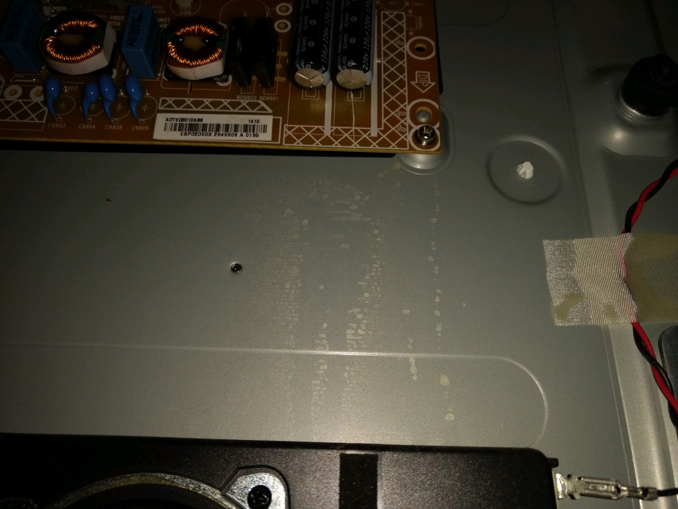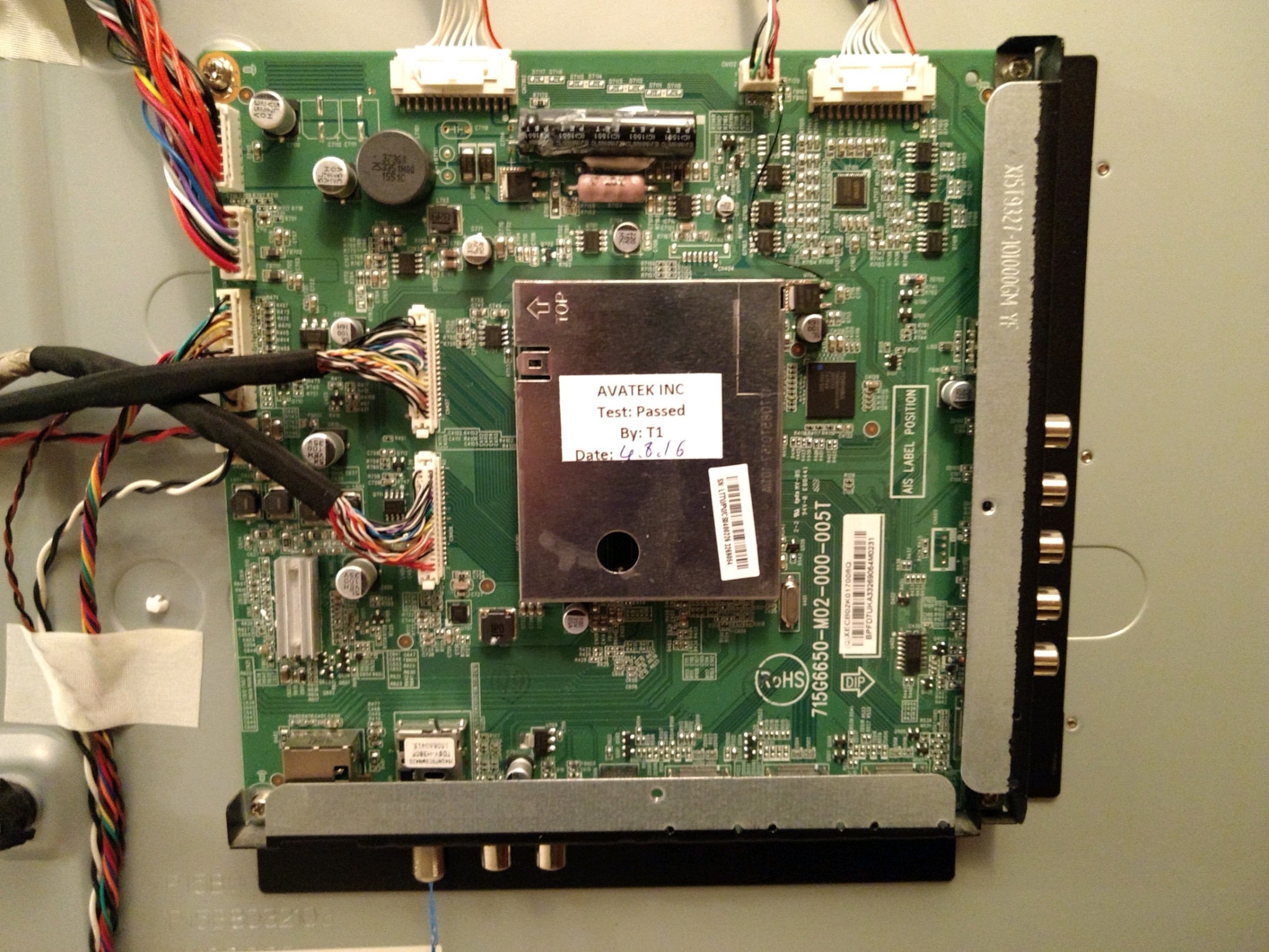 Today I bought this Vizio M422i-B1 with the complaint of white smoke coming from within the back of the TV. I found the two main caps are blown on top with a trail leading away from them. Even with this jacket the TV still works, turns on and otherwise functions normally.