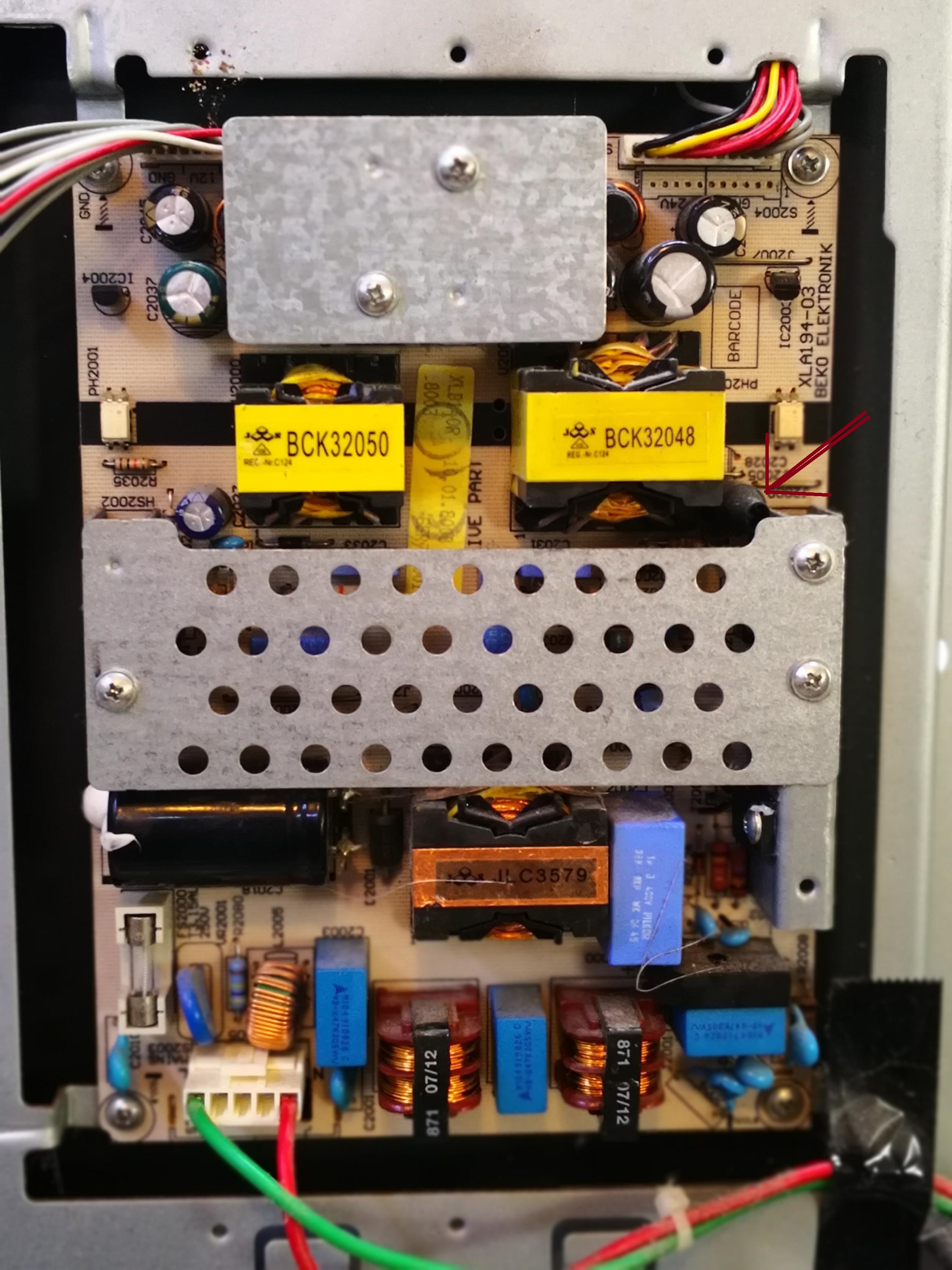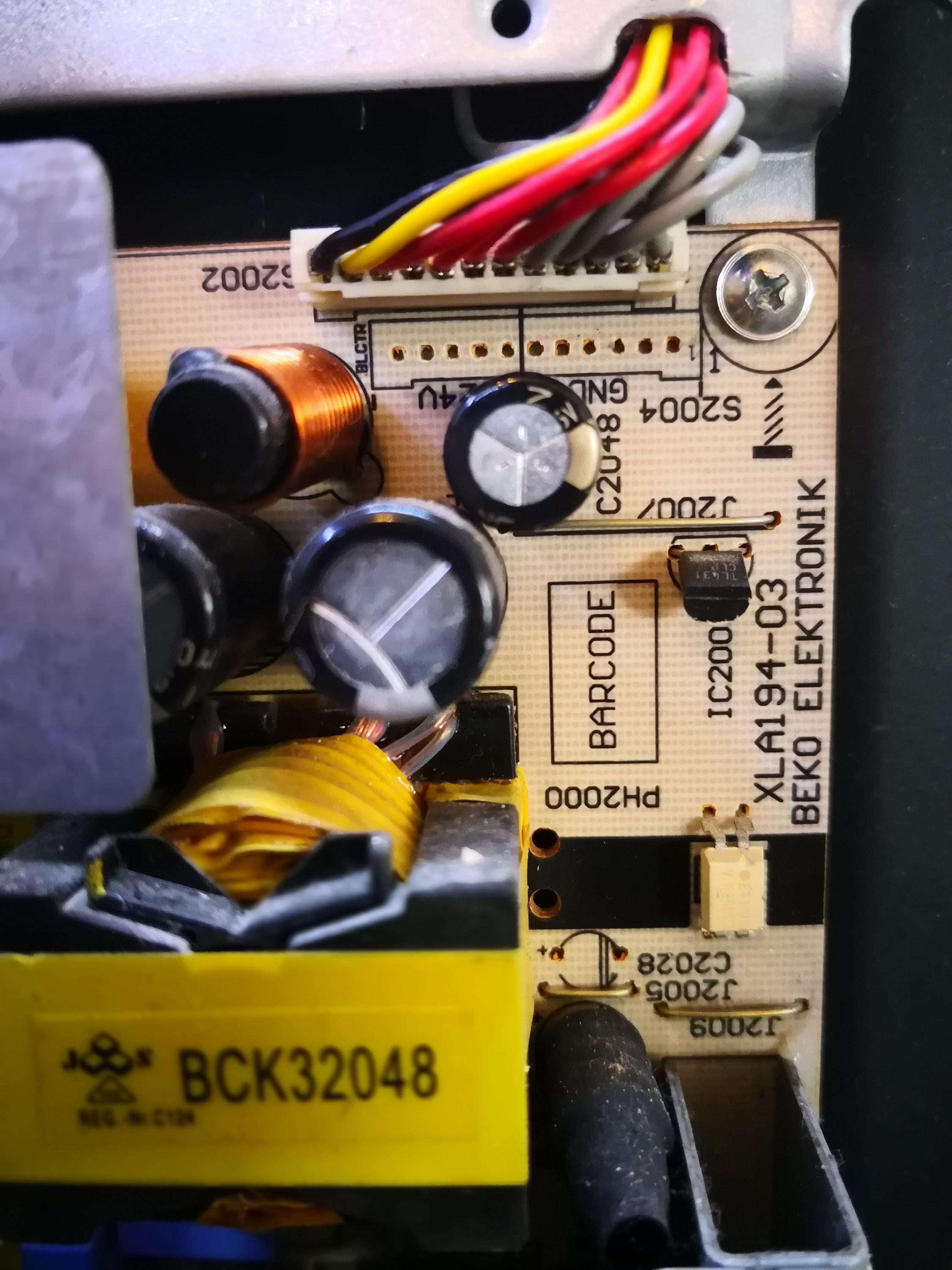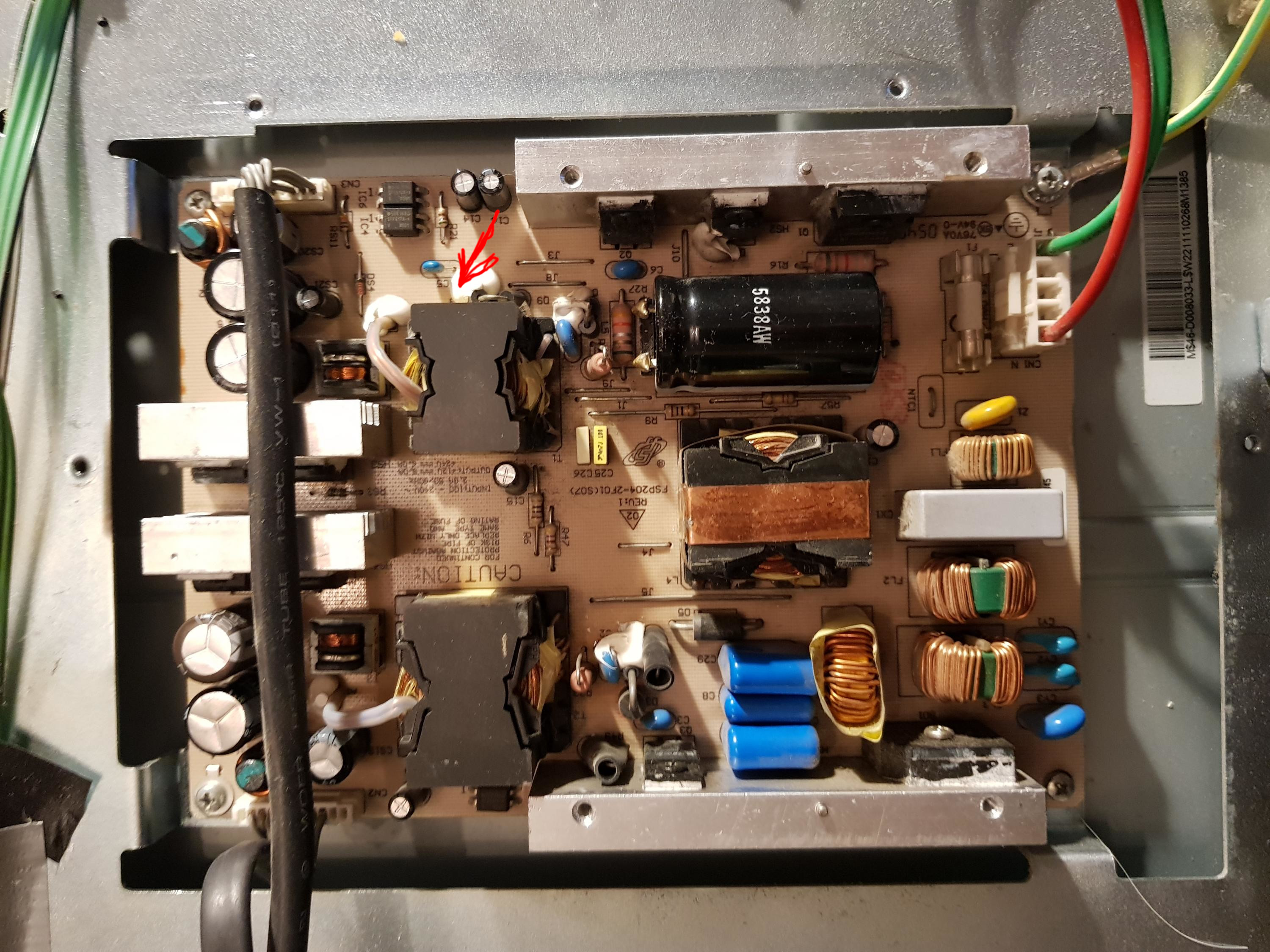 As an experiment, I tried 'jump-starting' it off an external 24V supply and after a flicker of the backlight the set came on, and continued running even after disconnecting the auxiliary supply. Even switching the set to standby and back on again, it continued OK. BUT disconnect the mains even for a few seconds and the fault returns.