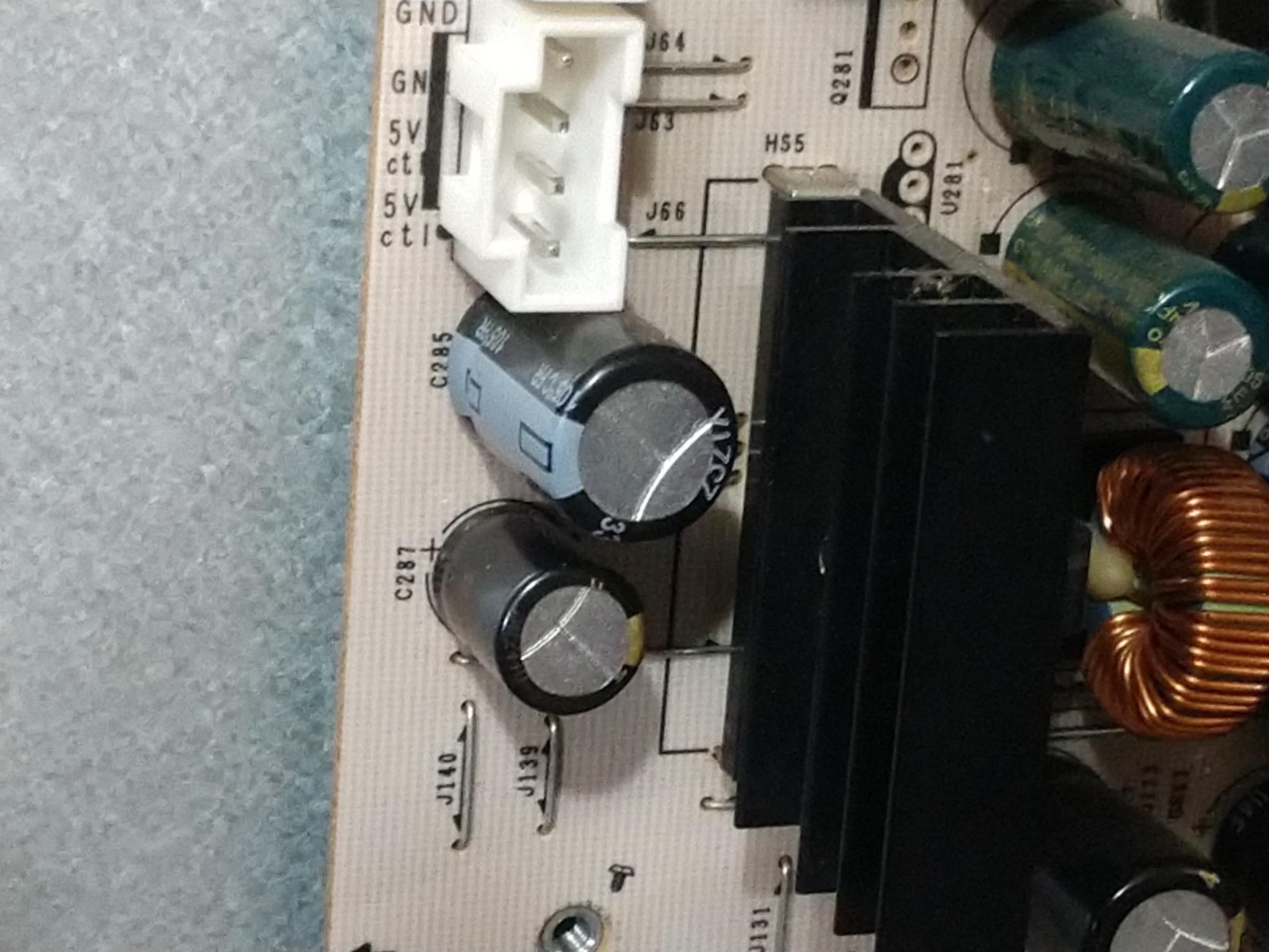hello everyone i am currently working on a vizio jv50phdtv10a with power supply aax30284301. for some reason when i test to voltages at the connectors all of the 5v supplies are putting out .81 volts instead of 5 volts. the p.o. attempted to replace the caps on this board and im pretty sure caps 285 and 287 are wrong, if anybody knows the values of those caps and any ideas as to why the 5v connects are only reading .81 volts that would be great. thank you in advance.