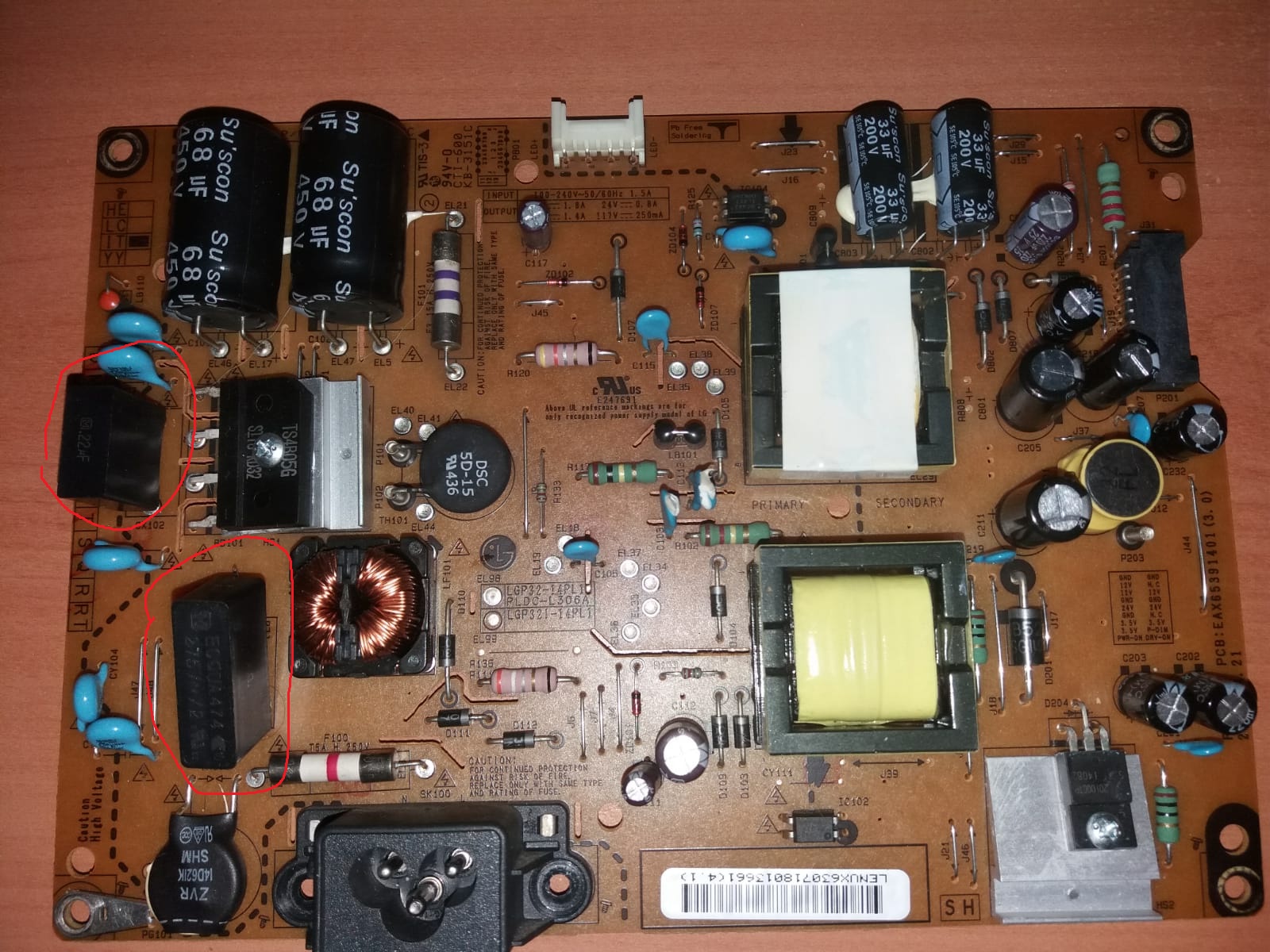 So, one day this tv stopped turning on, only flashed the red light once and then stopping, i took it apart and looked at the power supply, noticed two blown capacitors (the red circled ones) and replaced them, soldering was a bit wonky because one was longer but its the right farad and voltage, still nothing, no turning on no pic.