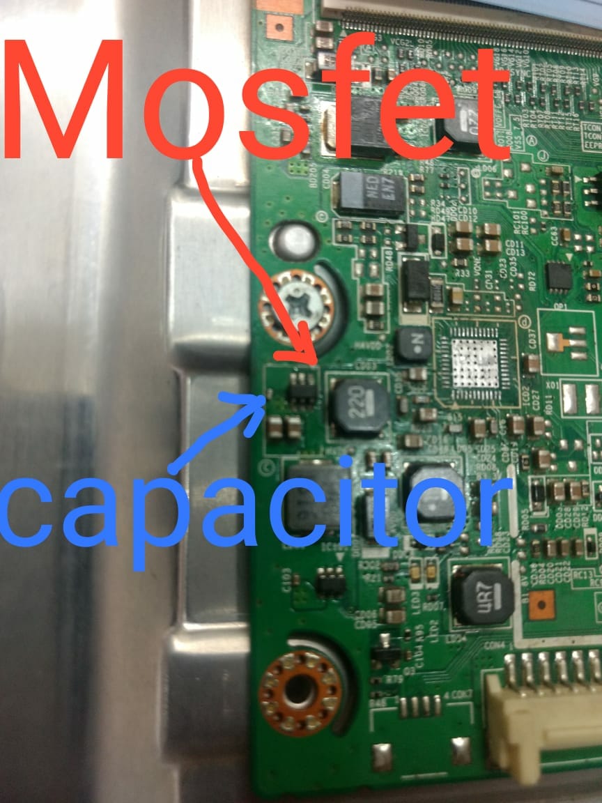 I tried one more t con of same pcb but of different model and got 2 images up and down section.But it was not dark as found in original t con.That T CON is suitable for UA40F6400.A very small capacitor is there between S and opposite terminal of 6 pin MOSFET.