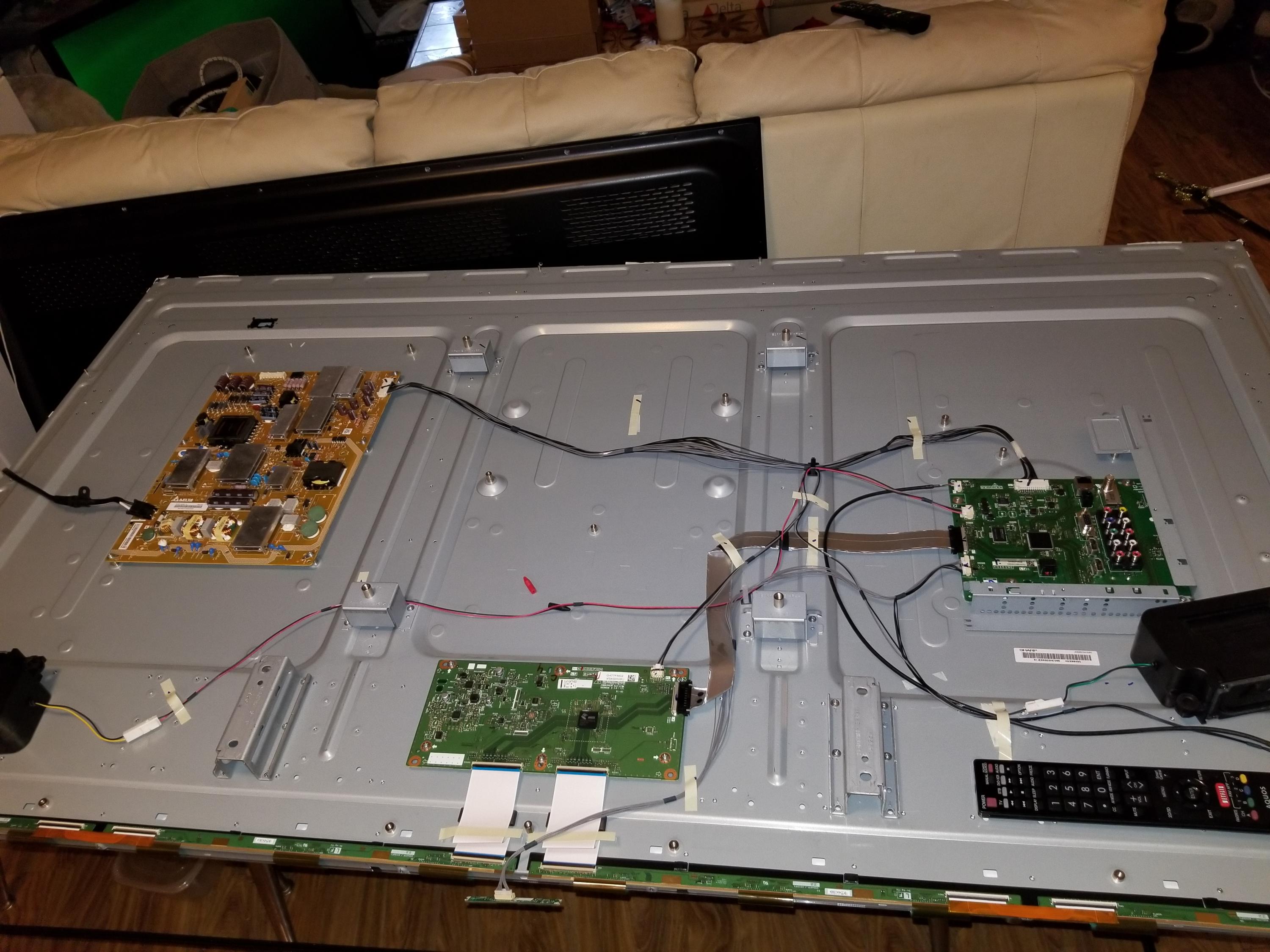 When I disconnect either side of the t-con, the side disconnected goes white and the other side looks fine (sharp logo etc). So BOTH sides show the image when the opposite is disconnected.