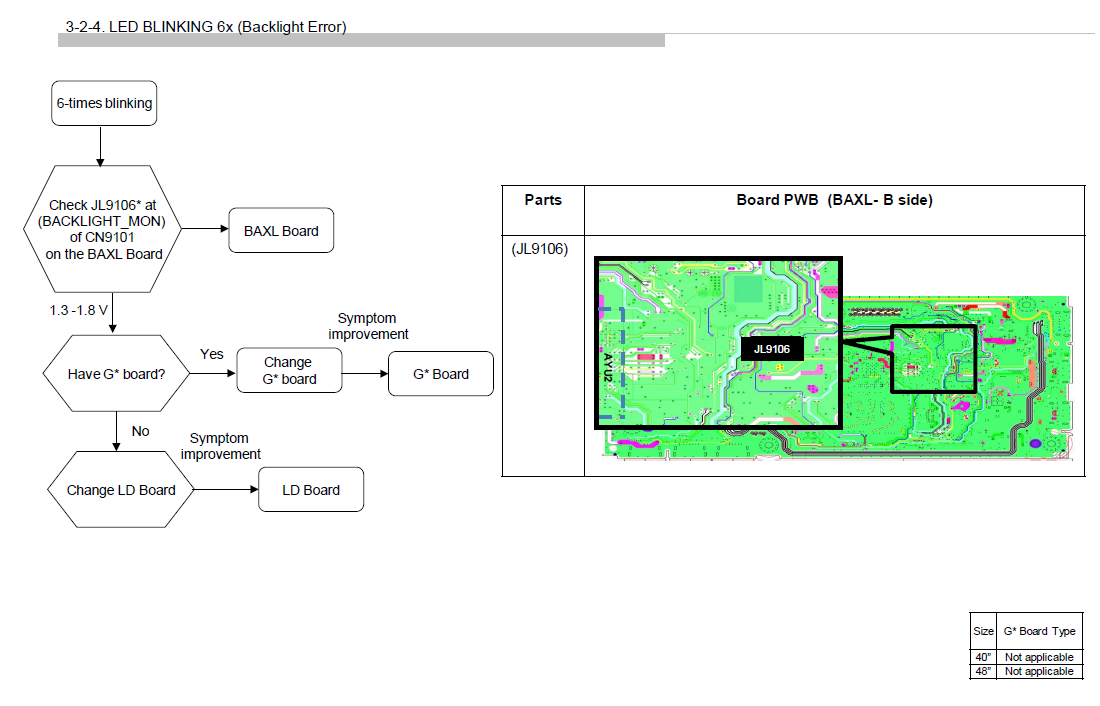 If you don't already have it, I attached the service manual. According to the service manual, the red LED flashing 6x is a backlight failure. This seems obvious from the symptoms, though.Attached Filesif you find these attachements useful please consider making a small donation to the site