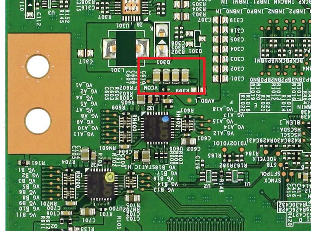 The area outlined in the picture below is a bank of SMD caps right off the VCOM test point. When continuity testing across all of these caps they indicate short, .006 ohms. Furthermore there is identical continuity from the VCOM test point to chassis ground.
